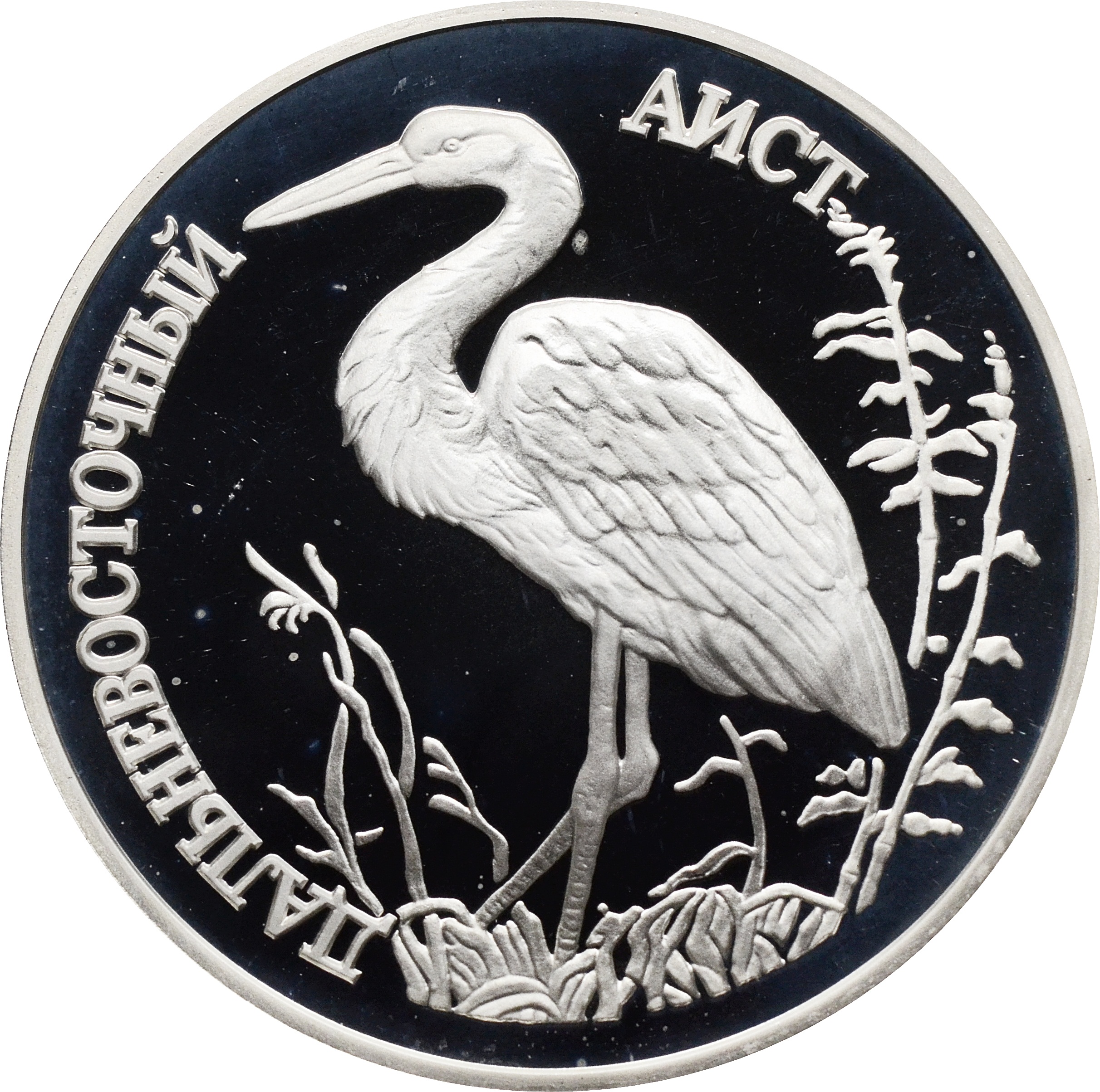 Реверс: левее центра монеты расположено рельефное изображение аиста. Ниже надпись: "Дальневосточный аист".