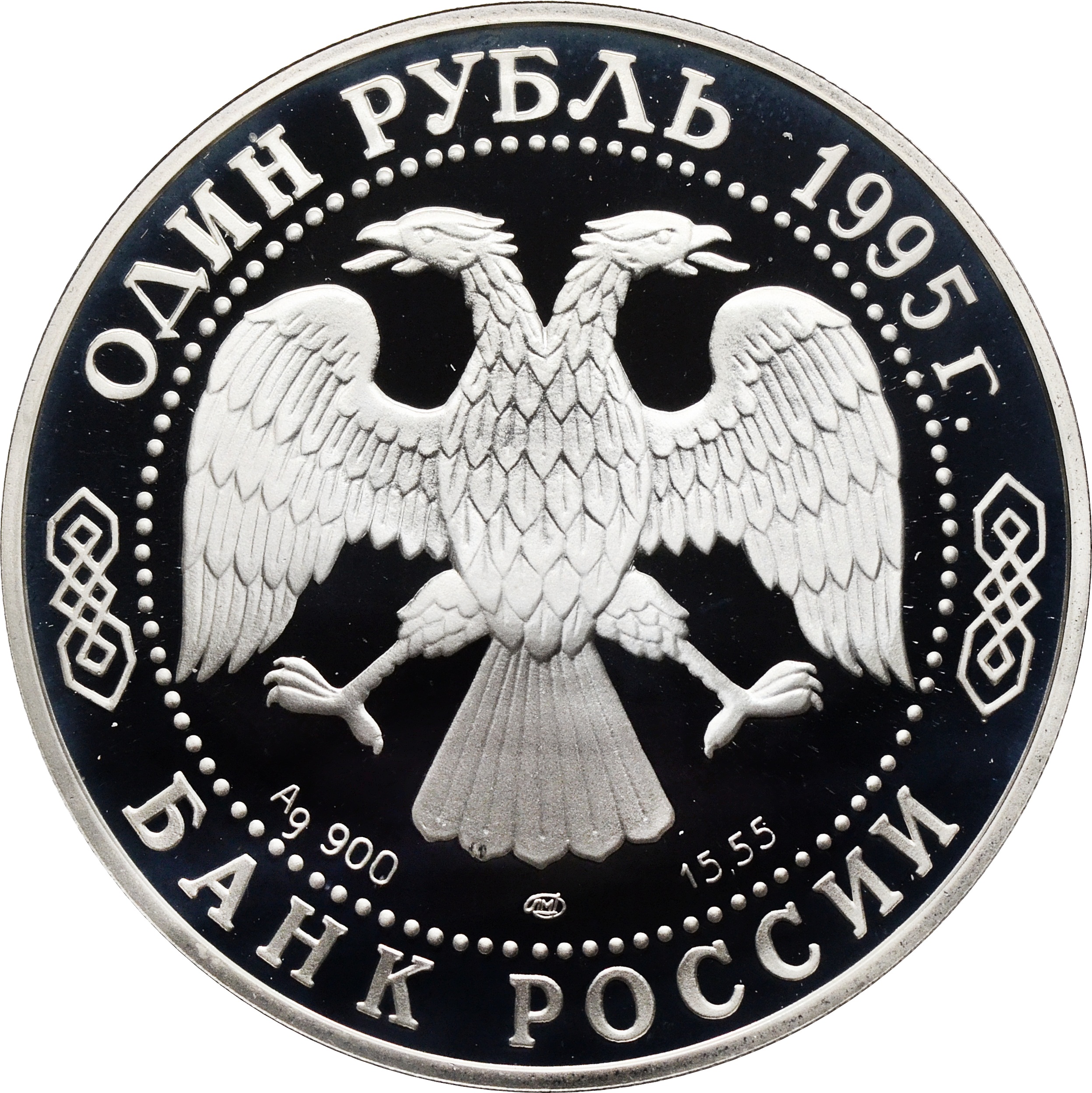 Аверс: в центре монеты герб Банка России. Над ним, вдоль канта, номинал полукругом: "ОДИН РУБЛЬ" и указан год чеканки: "1995г.". Снизу размещен товарный знак монетного двора - ЛМД и вес монеты: "15,55". Слева указан метал монеты: "Ag 900". Снизу, под гербом надпись: "БАНК РОССИИ".