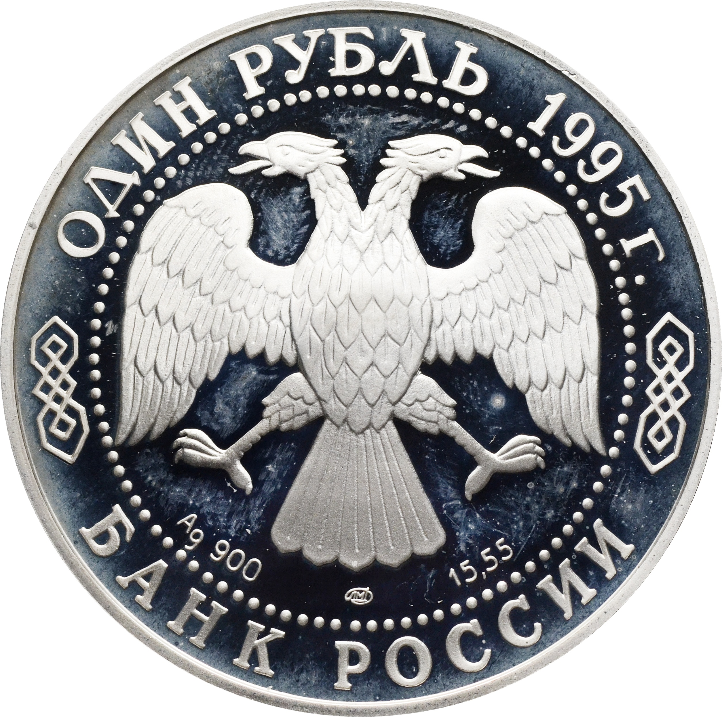 Аверс: в центре монеты герб Банка России. Над ним, вдоль канта, номинал полукругом: "ОДИН РУБЛЬ" и указан год чеканки: "1995г.". Снизу размещен товарный знак монетного двора - ЛМД и вес монеты: "15,55". Слева указан метал монеты: "Ag 900". Снизу, под гербом надпись: "БАНК РОССИИ".
