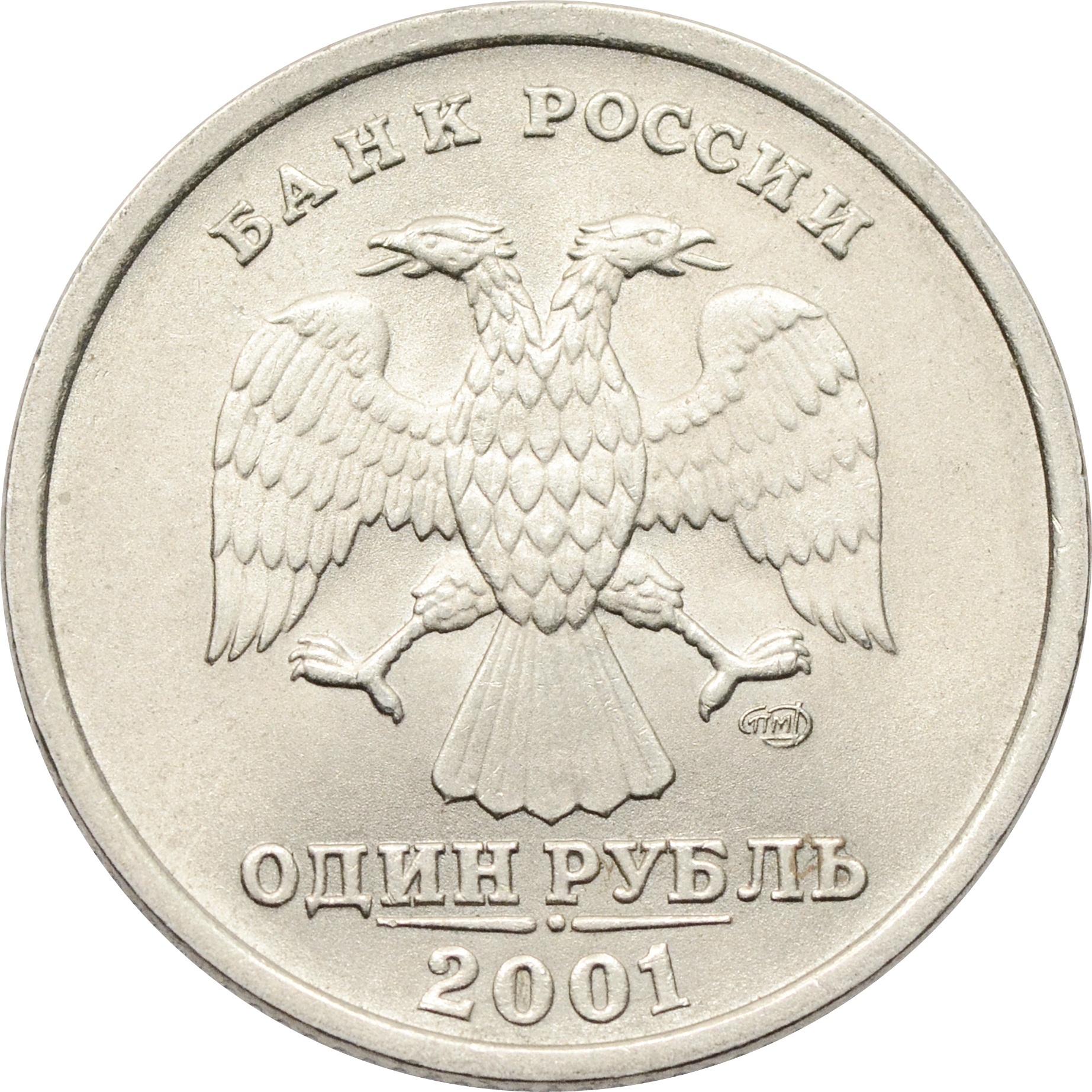 Аверс: в центре изображение двуглавого орла. Сверху над ним надпись: "БАНК РОССИИ". Под левой лапой орла знак монетного двора. Снизу указан номинал: "ОДИН РУБЛЬ" и год чеканки: "2001".