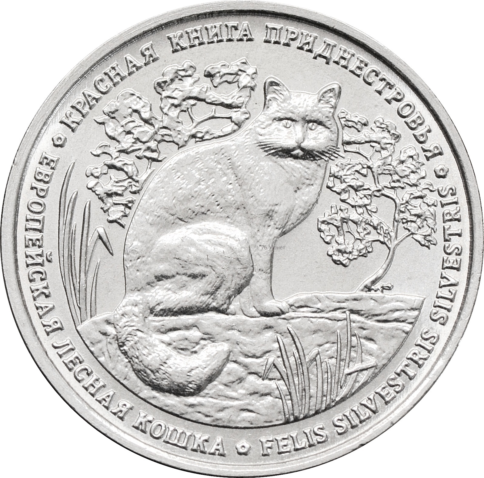 Реверс: по центру изображение двух дятлов у дерева. Вдоль канта надписи: сверху - "КРАСНАЯ КНИГА ПРИДНЕСТРОВЬЯ", а снизу - "ЕВРОПЕЙСКАЯ ЛЕСНАЯ КОШКА – FELIS SILVESTRIS SILVESTRIS".