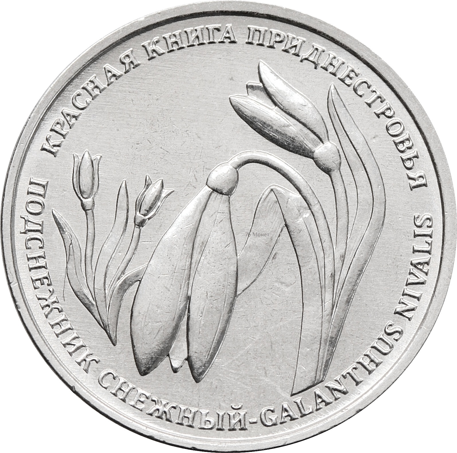 Реверс: по центру изображение подснежника. Вдоль канта надписи: сверху - "КРАСНАЯ КНИГА ПРИДНЕСТРОВЬЯ", а снизу - "ПОДСНЕЖНИК СНЕЖНЫЙ – GALANTHUS NIVALIS".