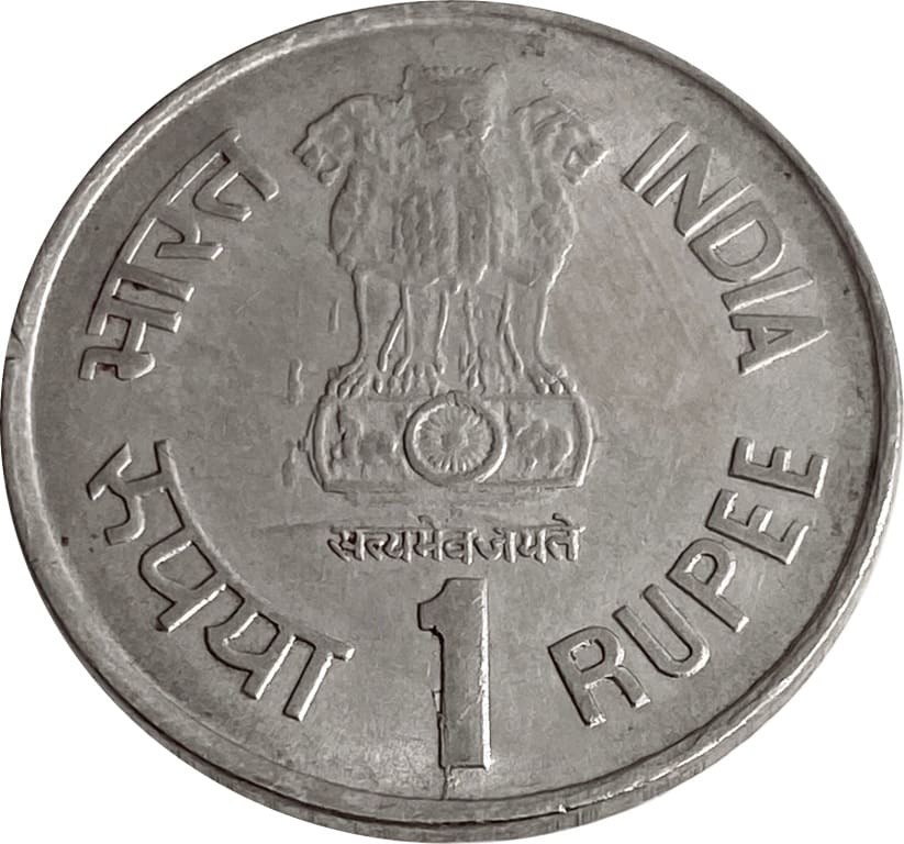 Реверс: по центру монеты расположен государственный герб Индии. Под ним указан номинал: "1". По бокам надписи: слева на хинди - "भारत", а справа на английском - "RUPEES INDIA".