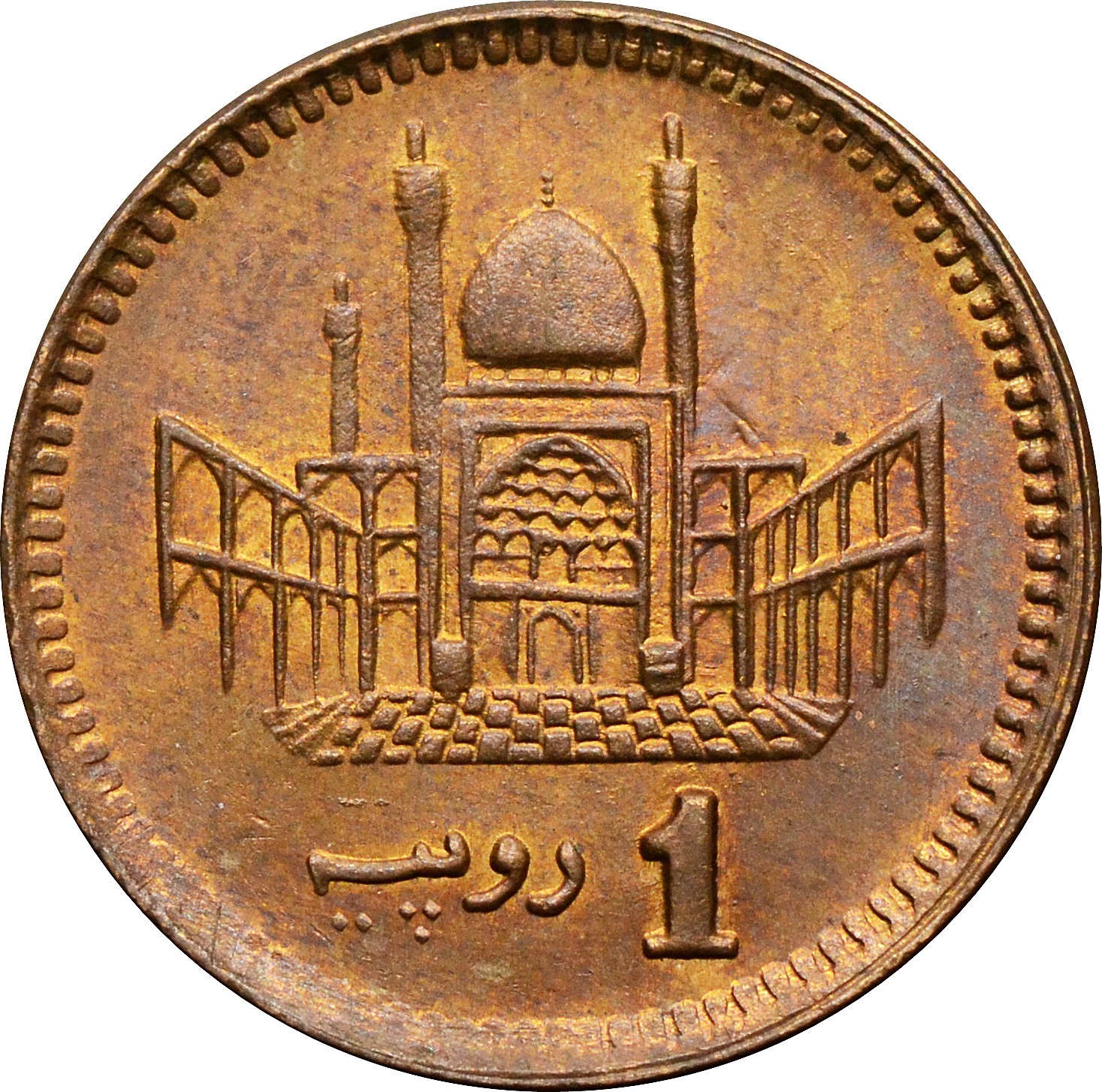 Реверс: по центру располагается мусульманская мечеть и ниже номинал: "1 روپیہ".