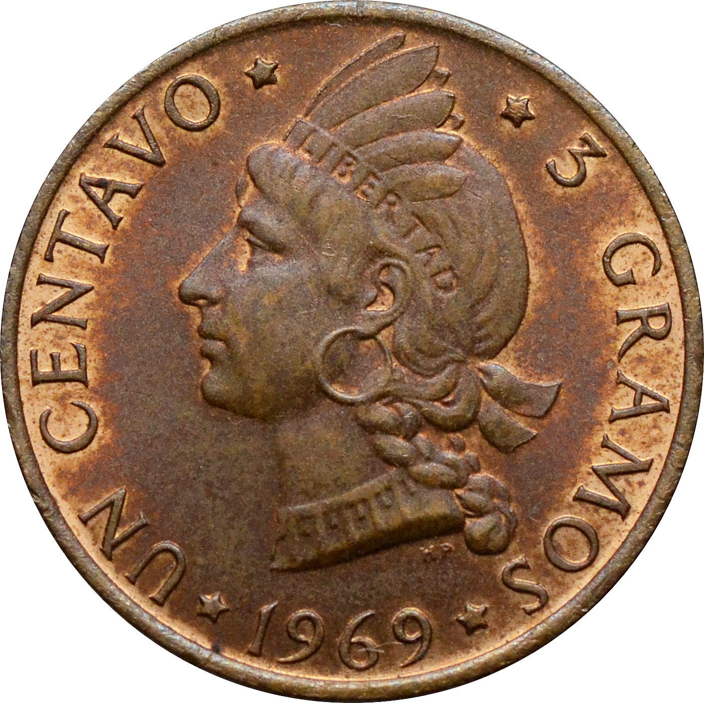Реверс: в центре изображен индеец влево. Вдоль канта надпись: "UN CENTAVO / 3 GRAMOS / 1969".