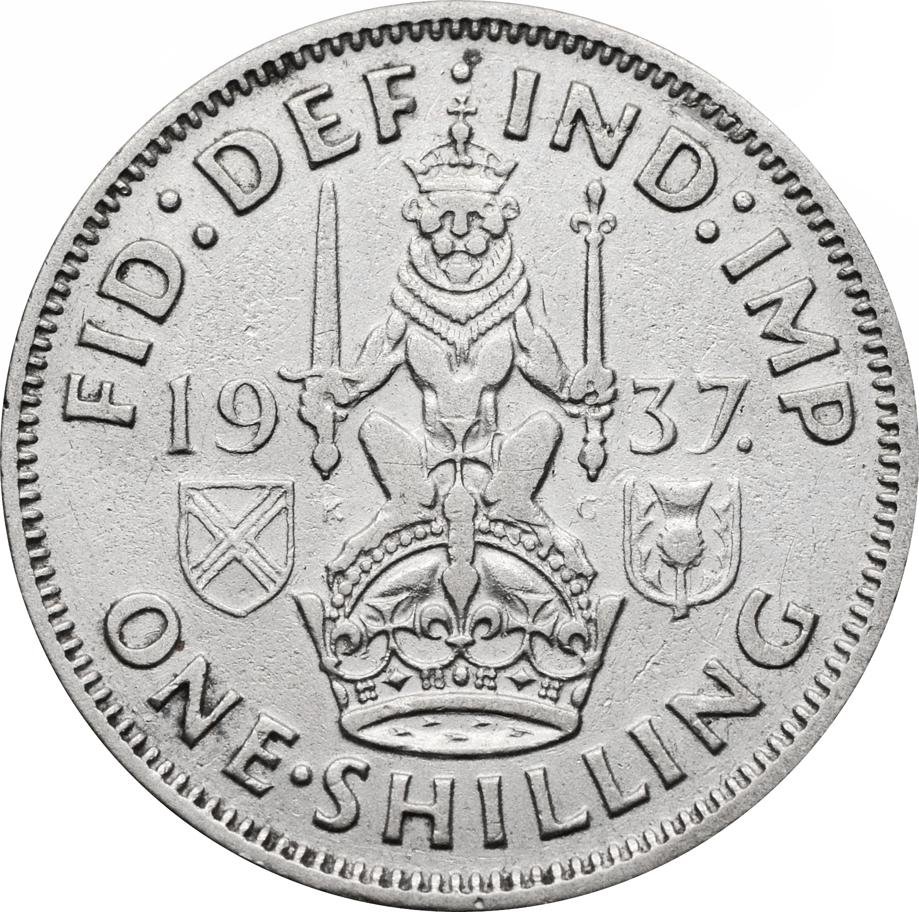 Реверс: по центру изображен лев, сидящий на короне. Сверху надпись: "FID:DEF IND:IMP", а снизу: "ONE SHILLING". Герб разделяет дату чеканки на два числа: "19-37".