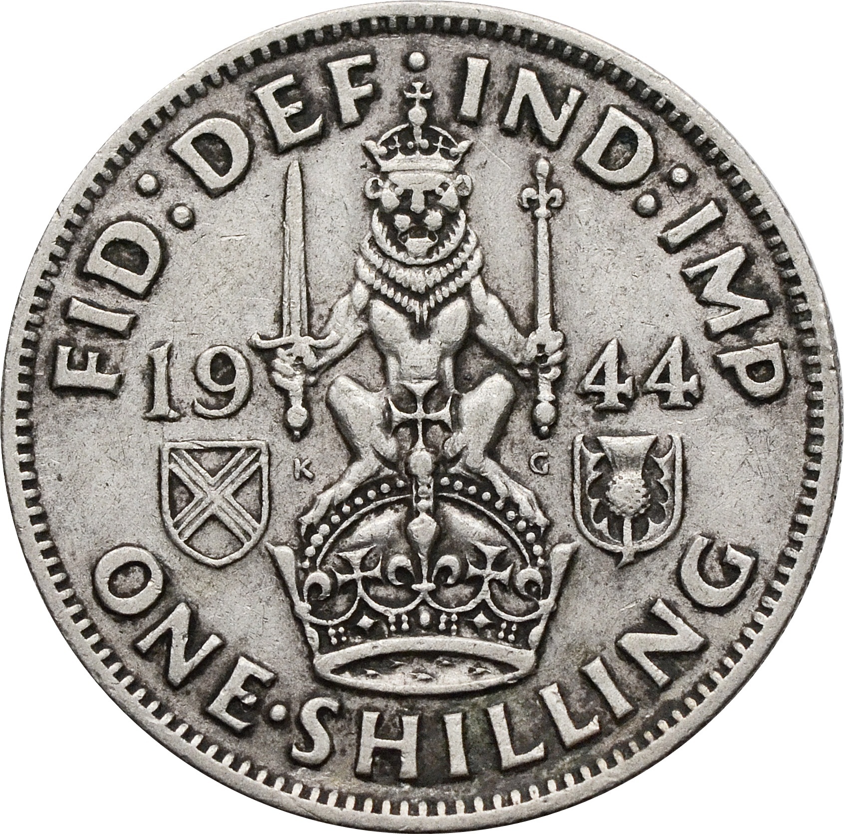 Реверс: по центру изображен лев, сидящий на короне. Сверху надпись: "FID:DEF IND:IMP", а снизу: "ONE SHILLING". Герб разделяет дату чеканки на два числа: "19" и "44".