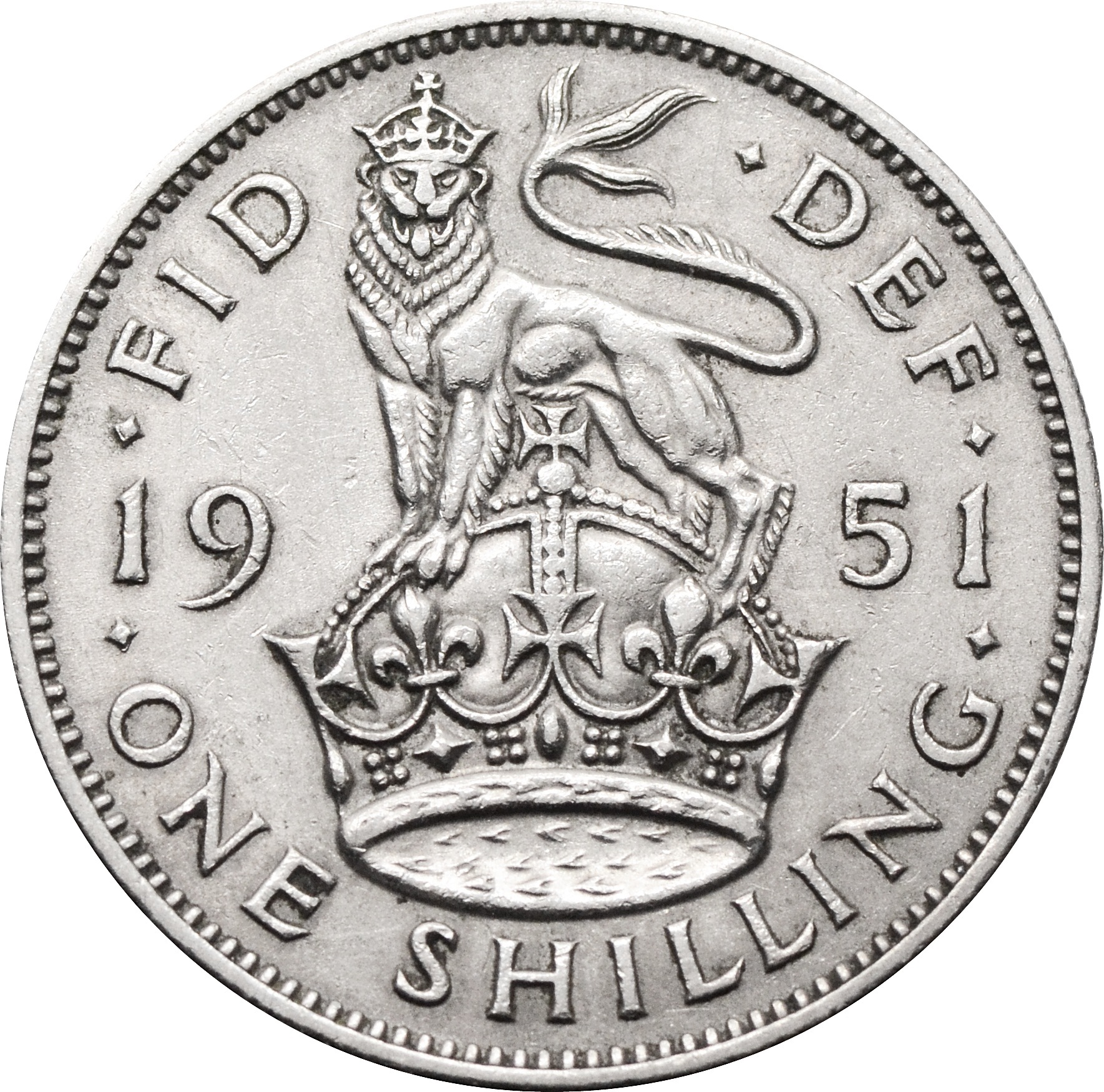 Реверс: по центру изображен лев, стоящий на короне. Сверху надпись: "FID:DEF IND:IMP", а снизу: "ONE SHILLING". Герб разделяет дату чеканки на два числа: "19" и "51".