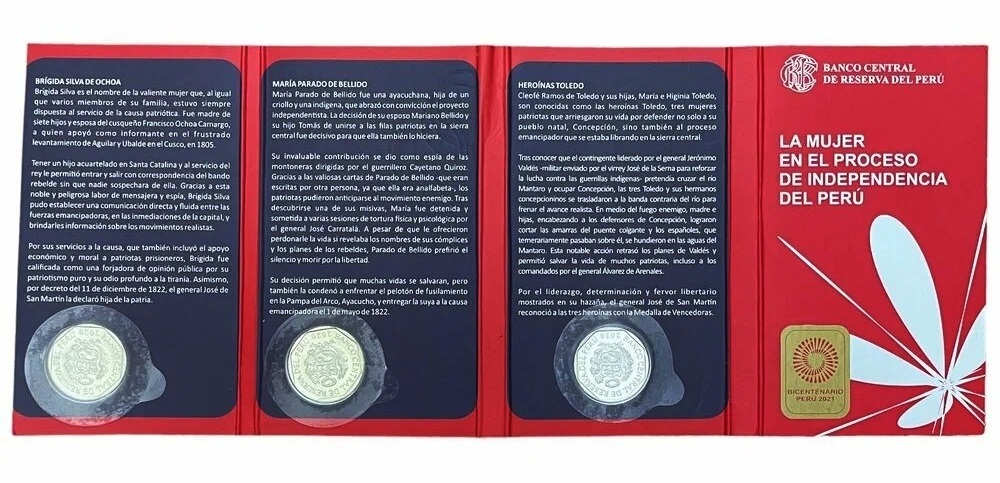 Официальный буклет с тремя монетами 1 соль 2020 Перу «200 лет революции, Женщины»