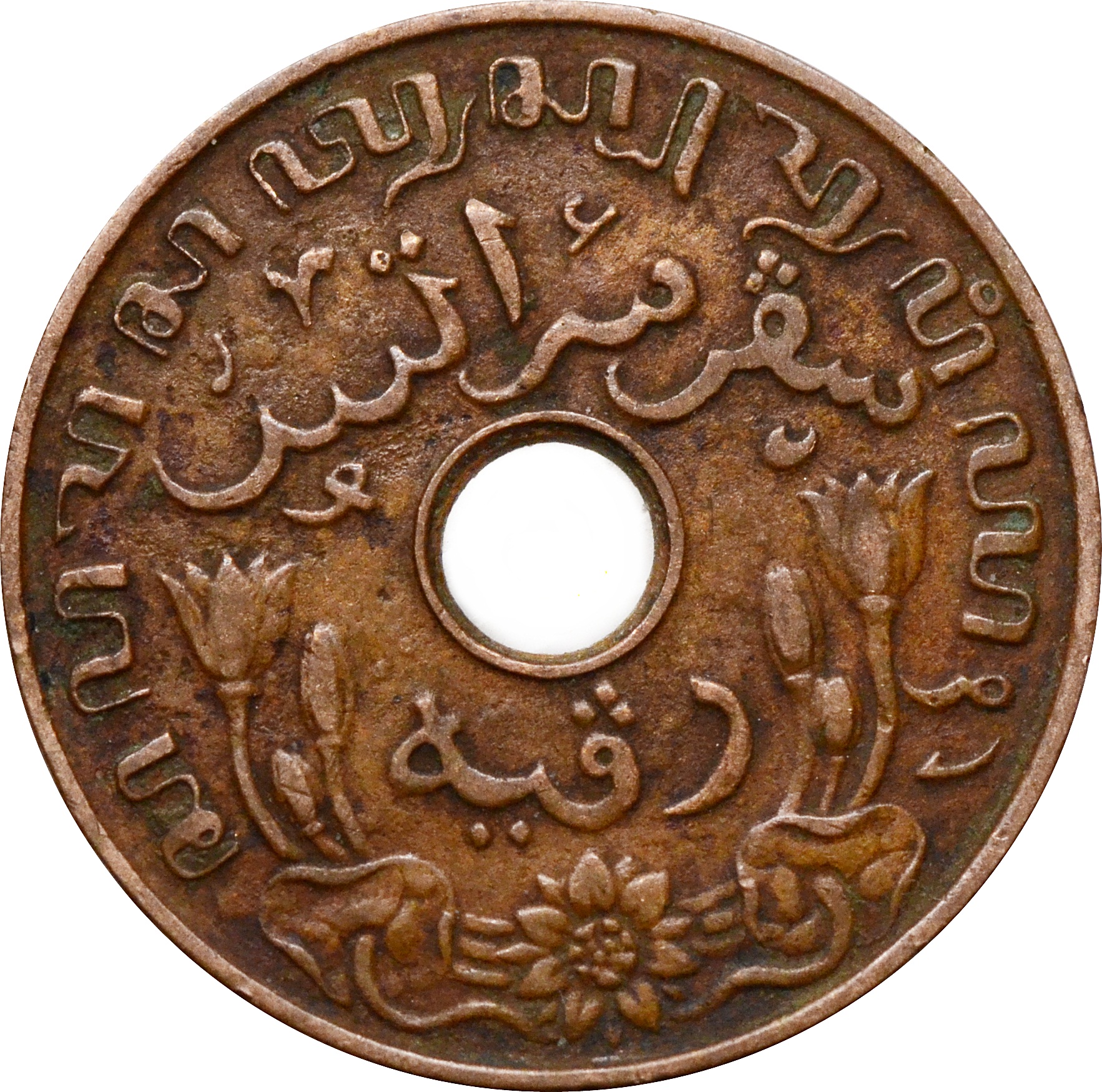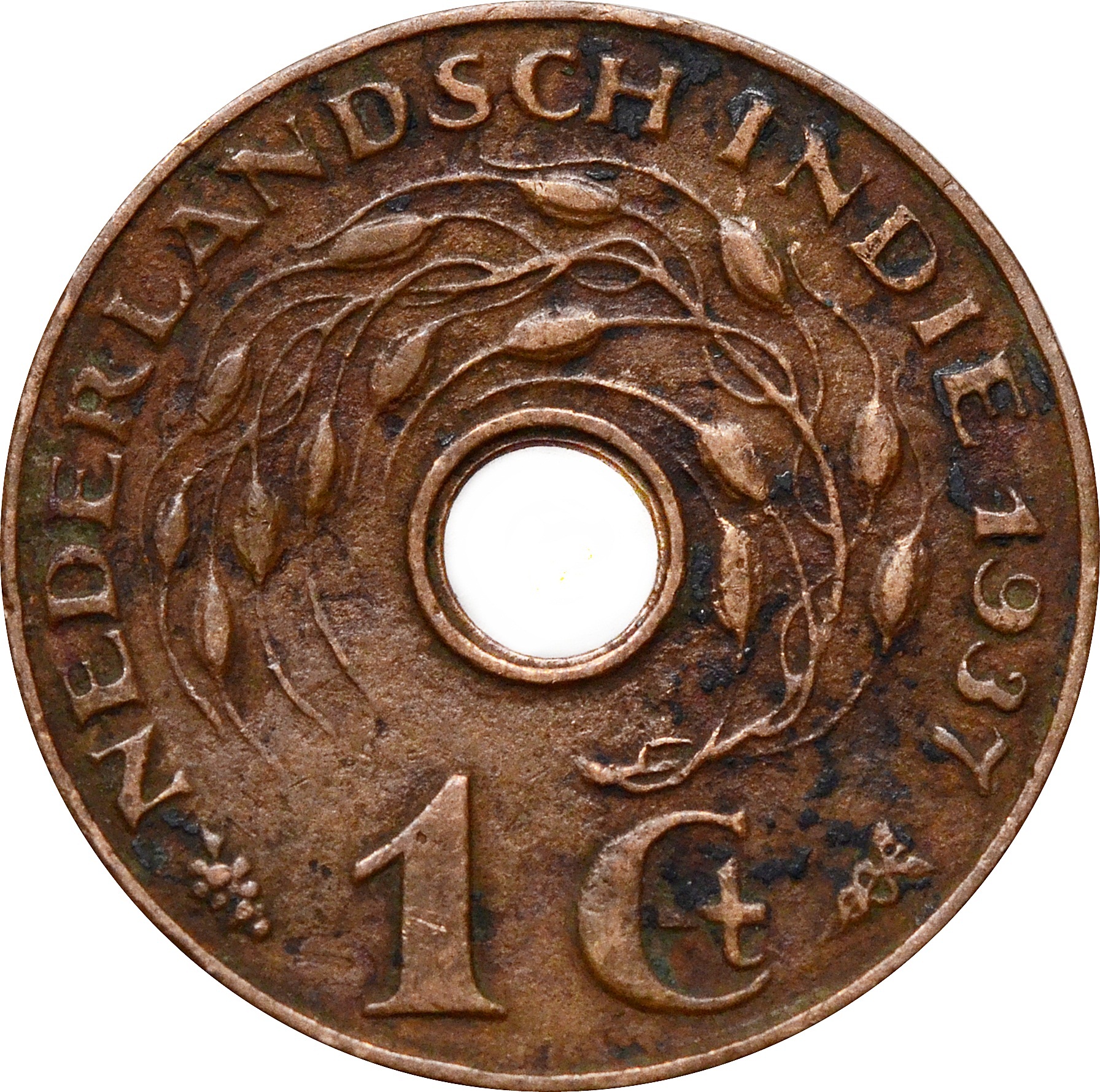 Реверс: вокруг центра монеты изображены растения. Снизу указан номинал: "1Ct". Вдоль верхнего края монеты текст: "NEDERLANDSCH INDIE 1937".