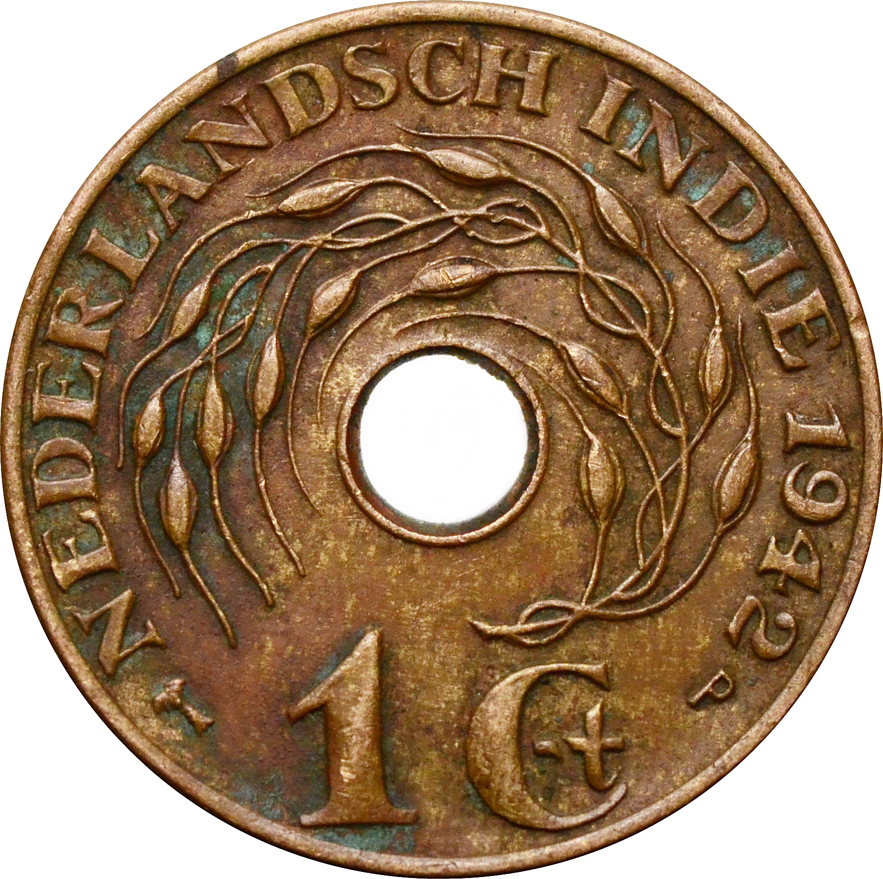 Реверс: вокруг центра монеты изображены растения. Снизу указан номинал: "1Ct". Вдоль верхнего края монеты текст: "NEDERLANDSCH INDIE 1942".