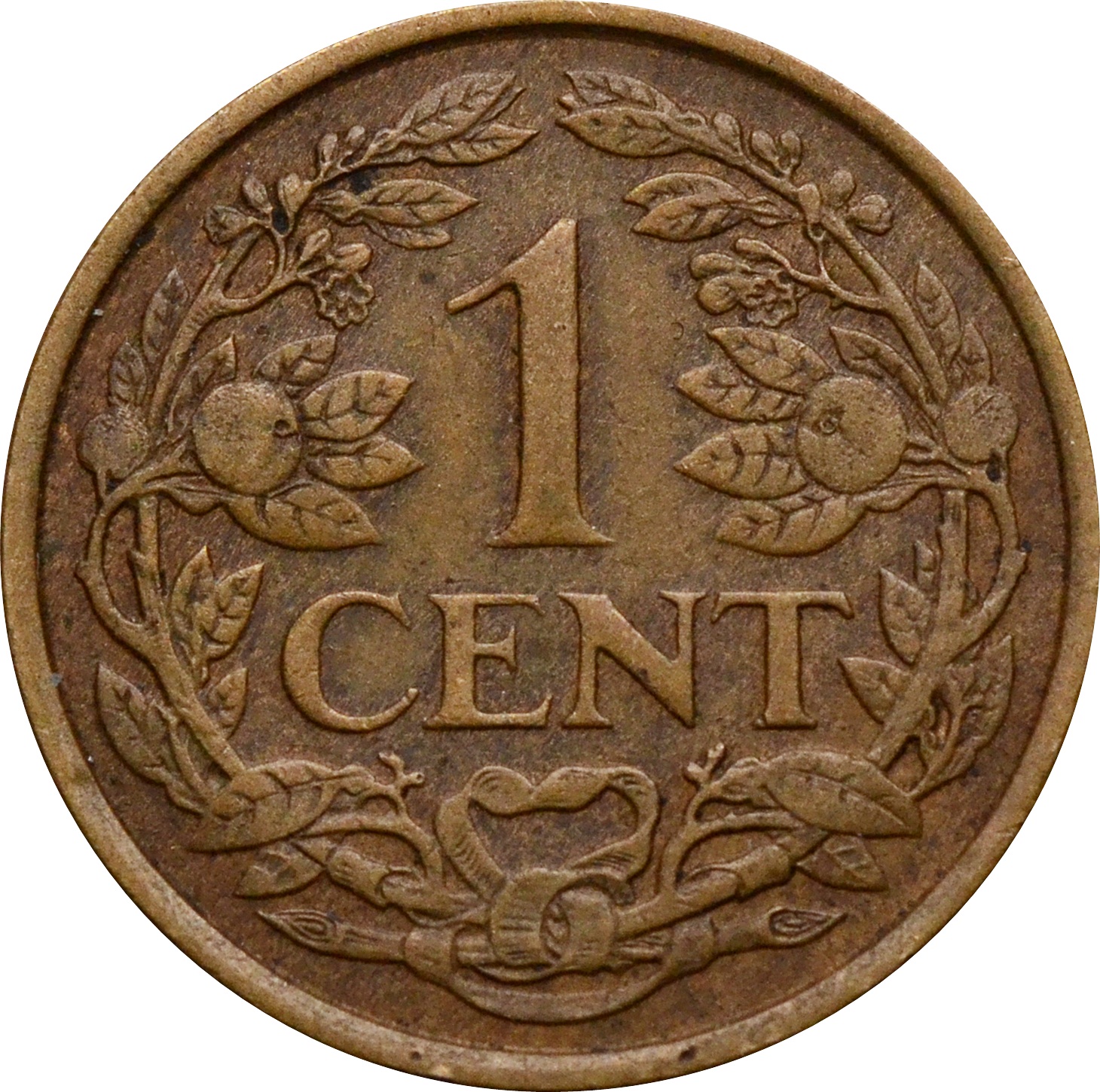 Реверс: прямо по центру монеты располагается номинал: "1 CENT". Вокруг номинала расположился древесно-лиственный венок.