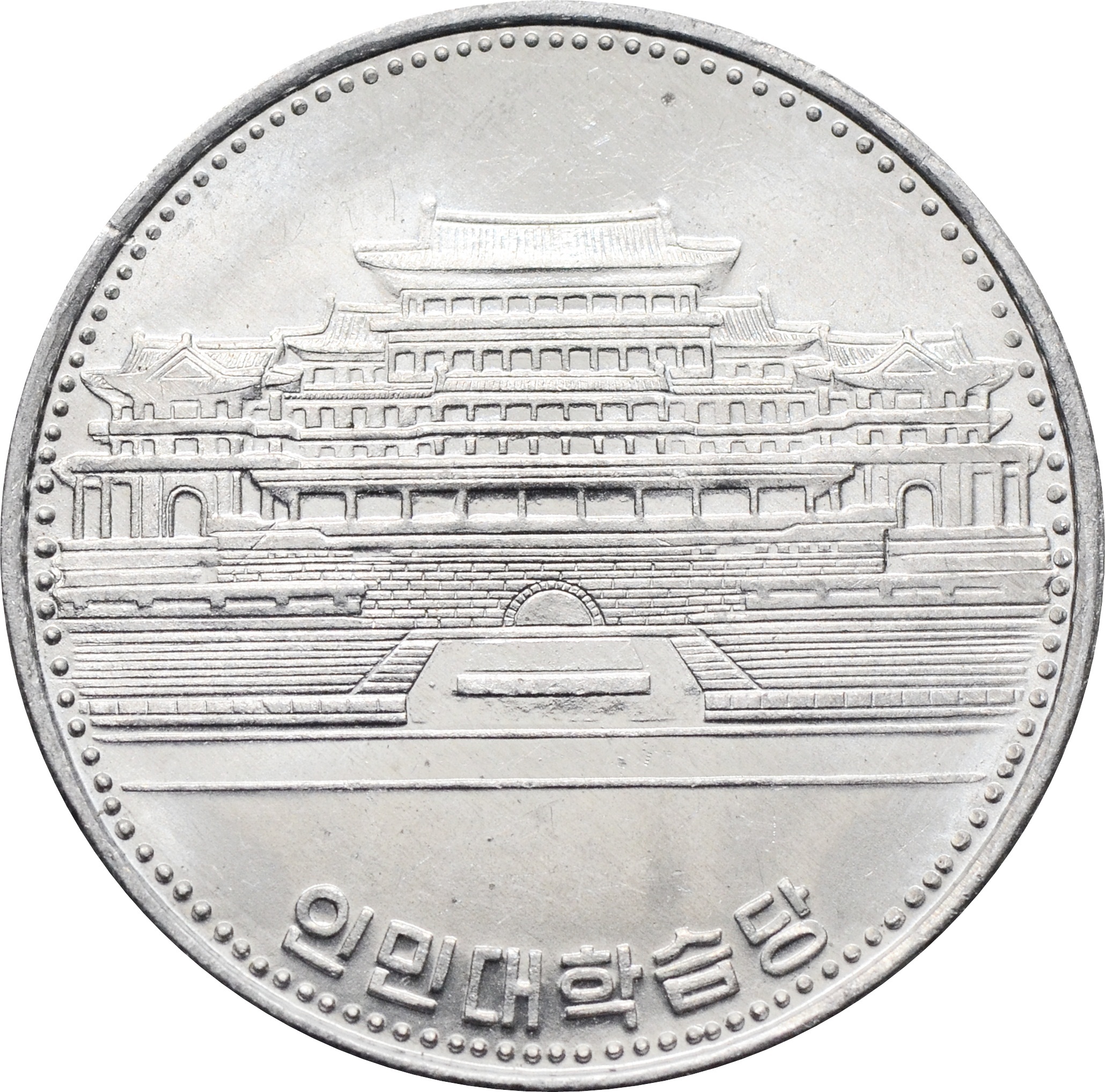 Реверс: в центре монеты изображен народный дворец учёбы. Ниже подпись: "인민대학습당".