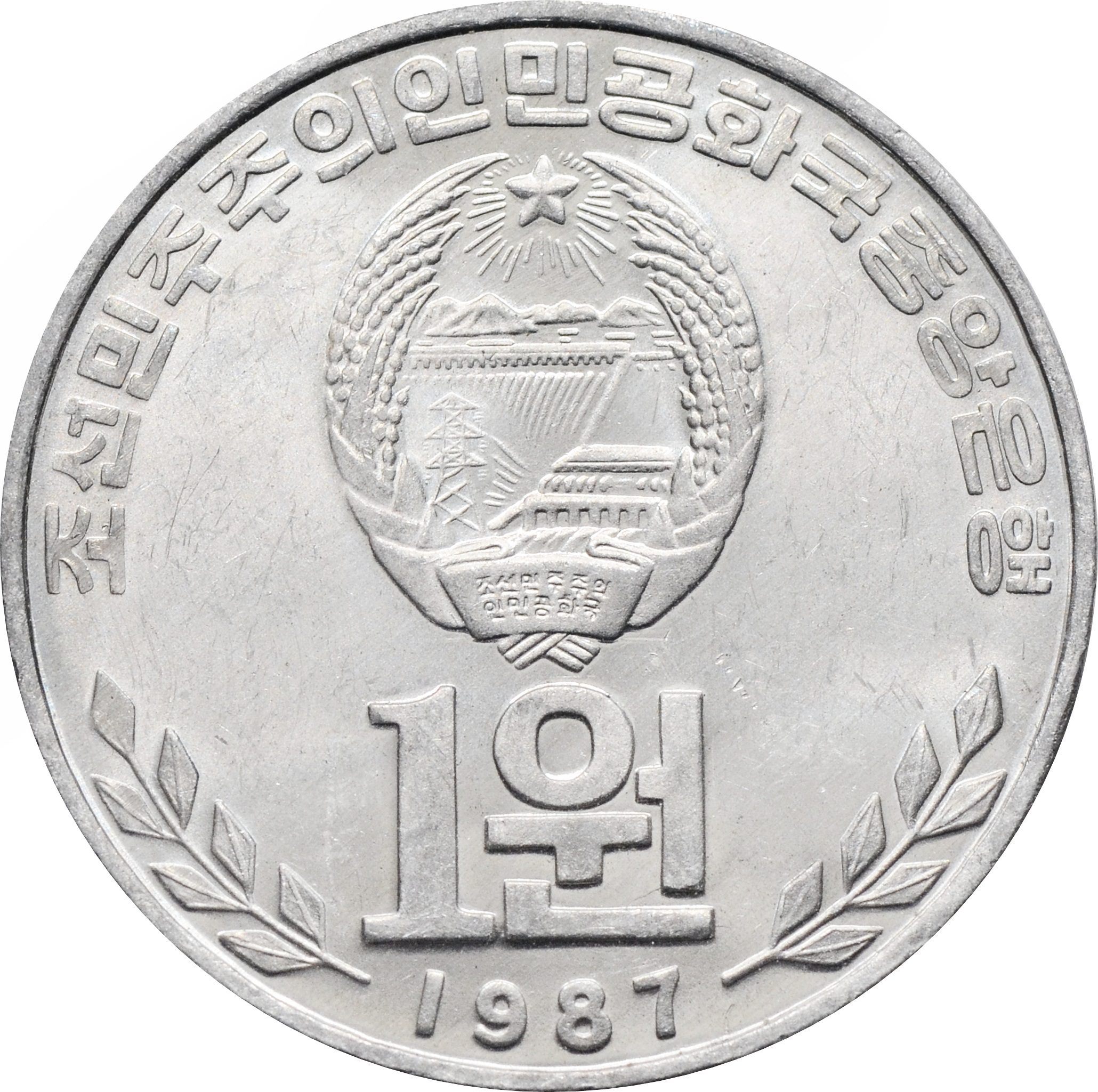 Аверс: по центру размещен герб Северной Кореи. Под ним указание номинала: "1원" и года чеканки: "1987". Сверху надпись: "조선민주주의인민공화국중앙은행".