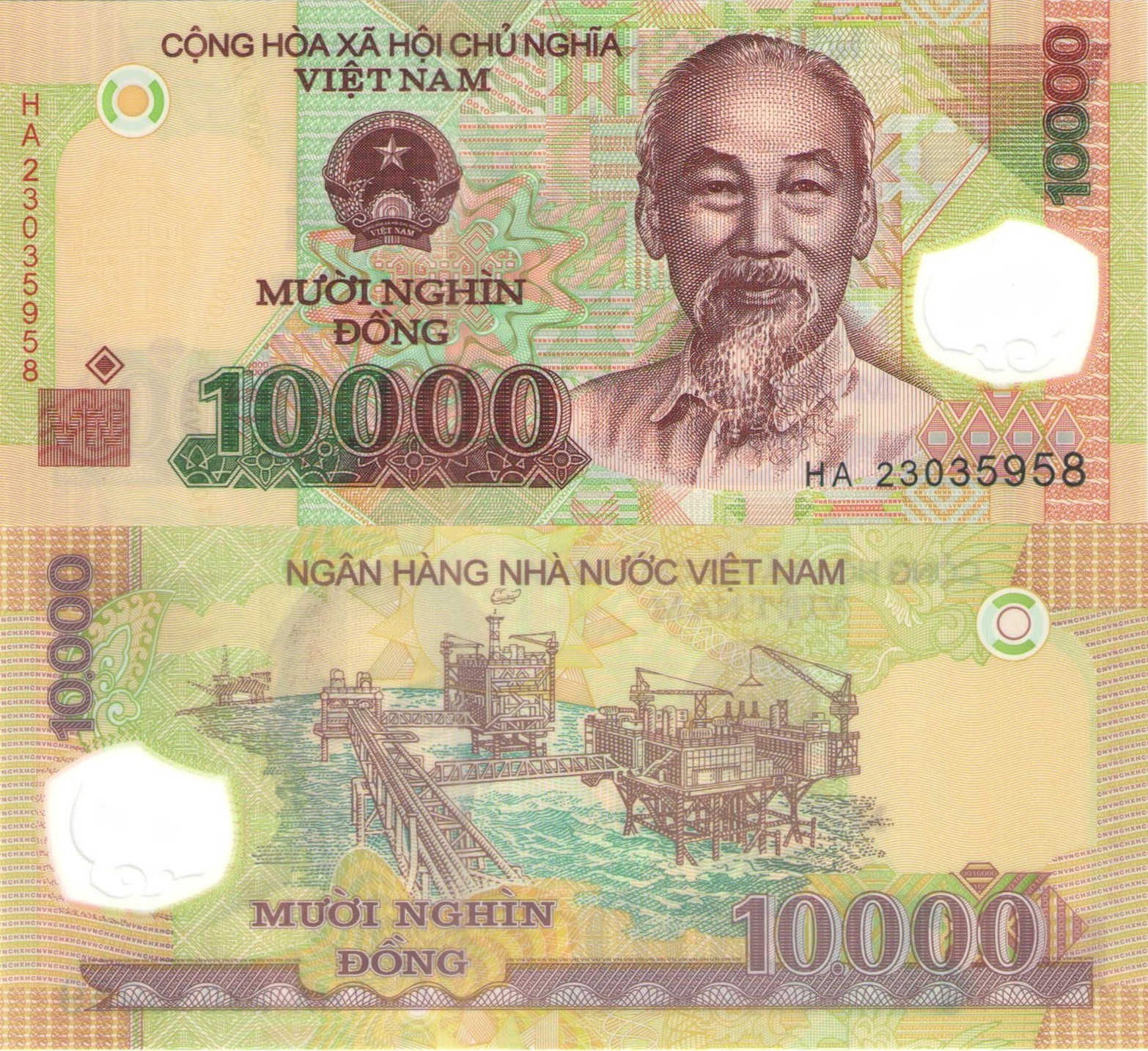 Лицевая сторона: в правой части банкноты расположен портрет Вьетнамского революционера Хо Ши Мина. В верхнем правом и нижнем левом углах размещена цифра номинала: "10000". В левой части можно увидеть герб Вьетнама. По центру находится номинал прописью и серийный номер банкноты.