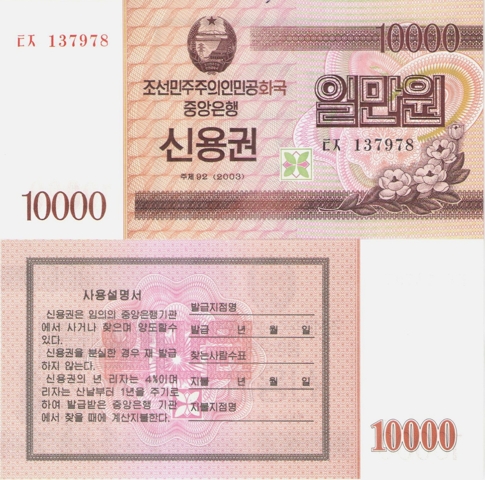 Лицевая сторона: в центре банкноты герб Корейской Народно-Демократической Республики — один из государственных символов КНДР. Нижу надписи на корейском и расположен год образца банкноты: "2003". По углам купюры цифровой номинал: "10000". В левом верхнем и правом нижнем углах серийный номер банкноты.