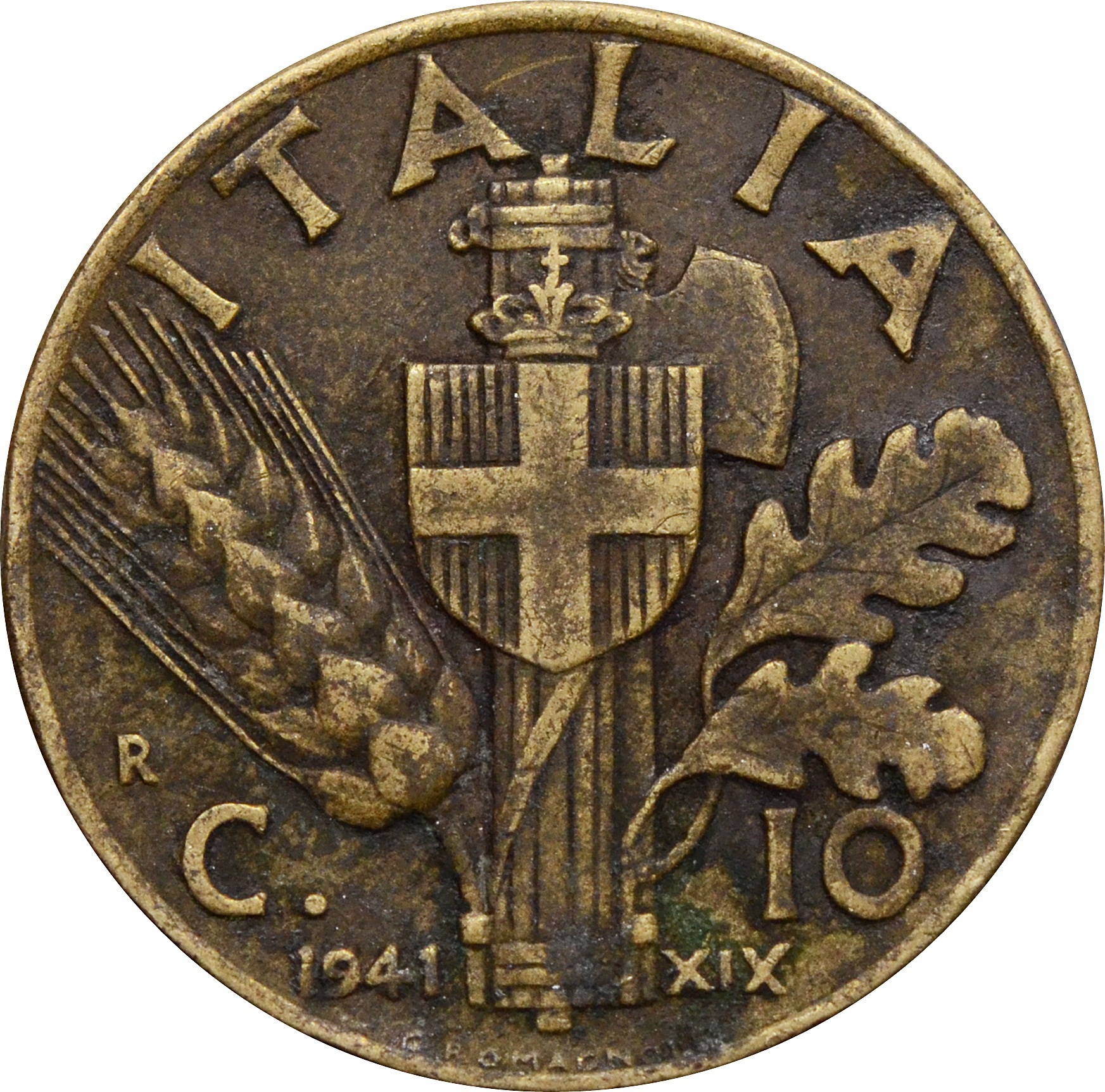 Монета 10 чентезимо 1941 Италия в состоянии XF.