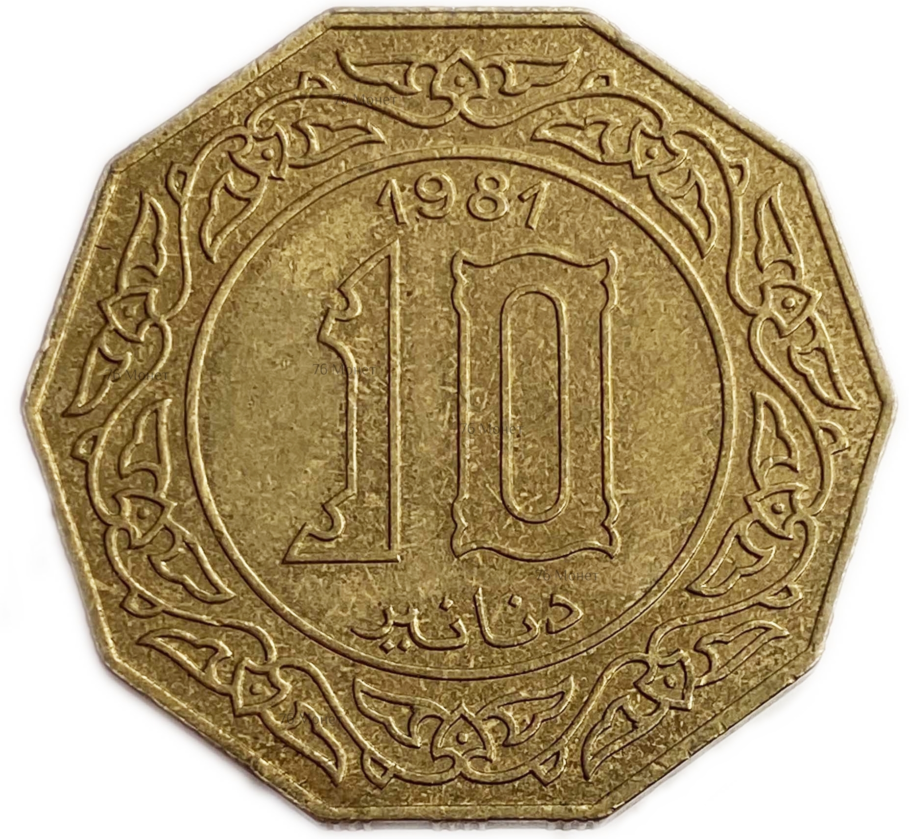 Реверс: по центру, в круге, указан номинал: "10 دنانير". Над номиналом год чеканки: "1981".