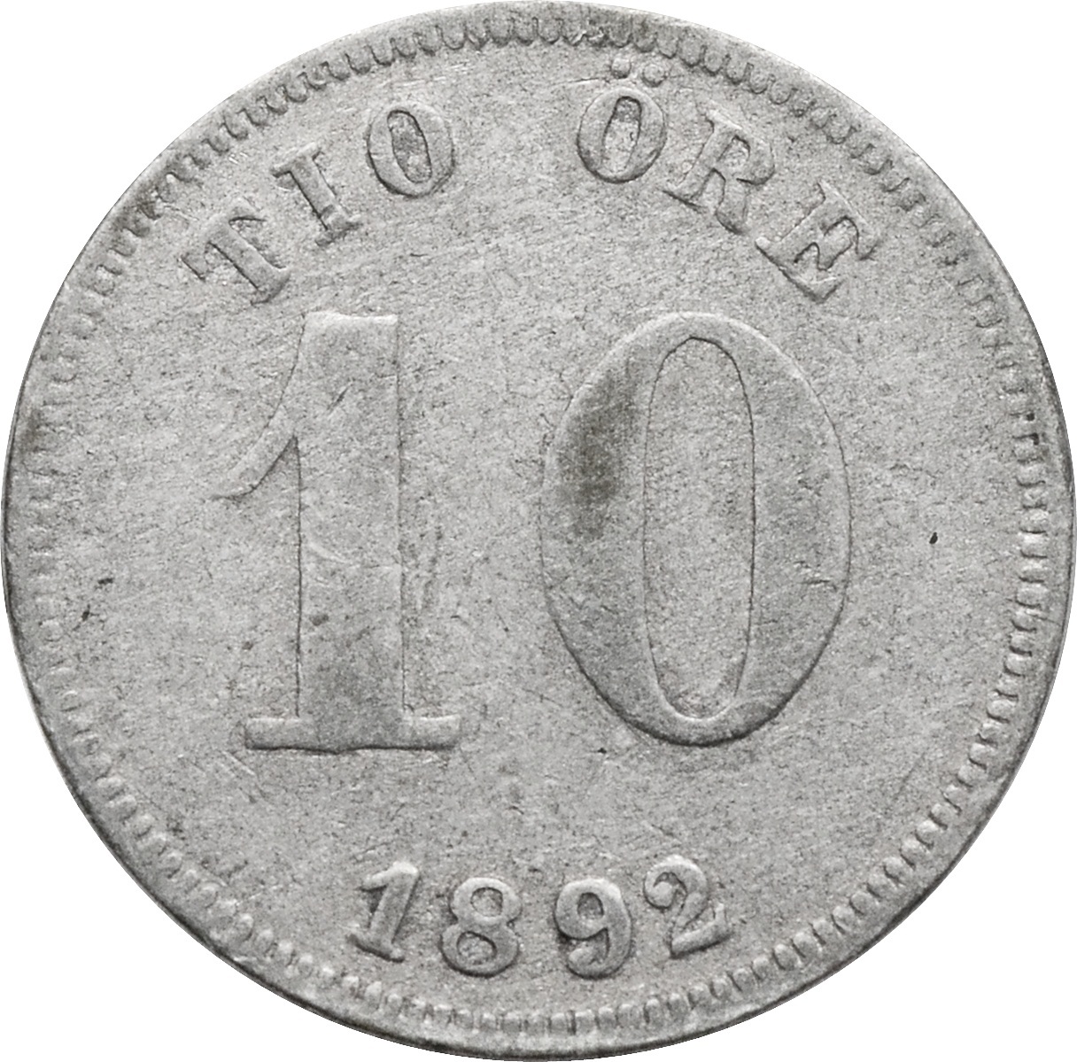 Реверс: прямо по центру расположен номинал: "TIO ÖRE 10". Снизу указан год чеканки монеты: "1892".
