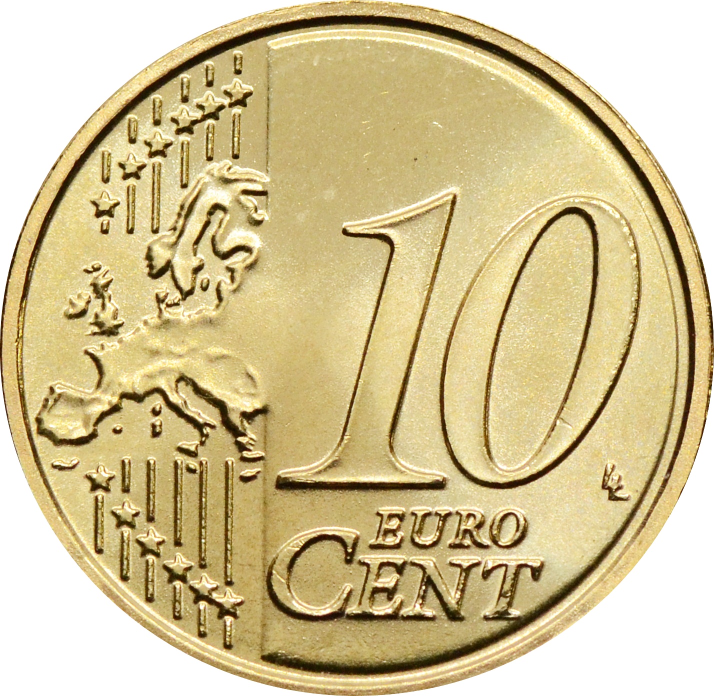 Реверс: в центре указан номинал монеты: "10 EURO CENT". От нижнего левого к верхнему правому краю, по диагонали, проходят шесть линий, на концах которых расположено 12 звёзд. Справа внизу на середине линий изображён земной шар, на переднем плане земного шара представлена европейская часть континента.