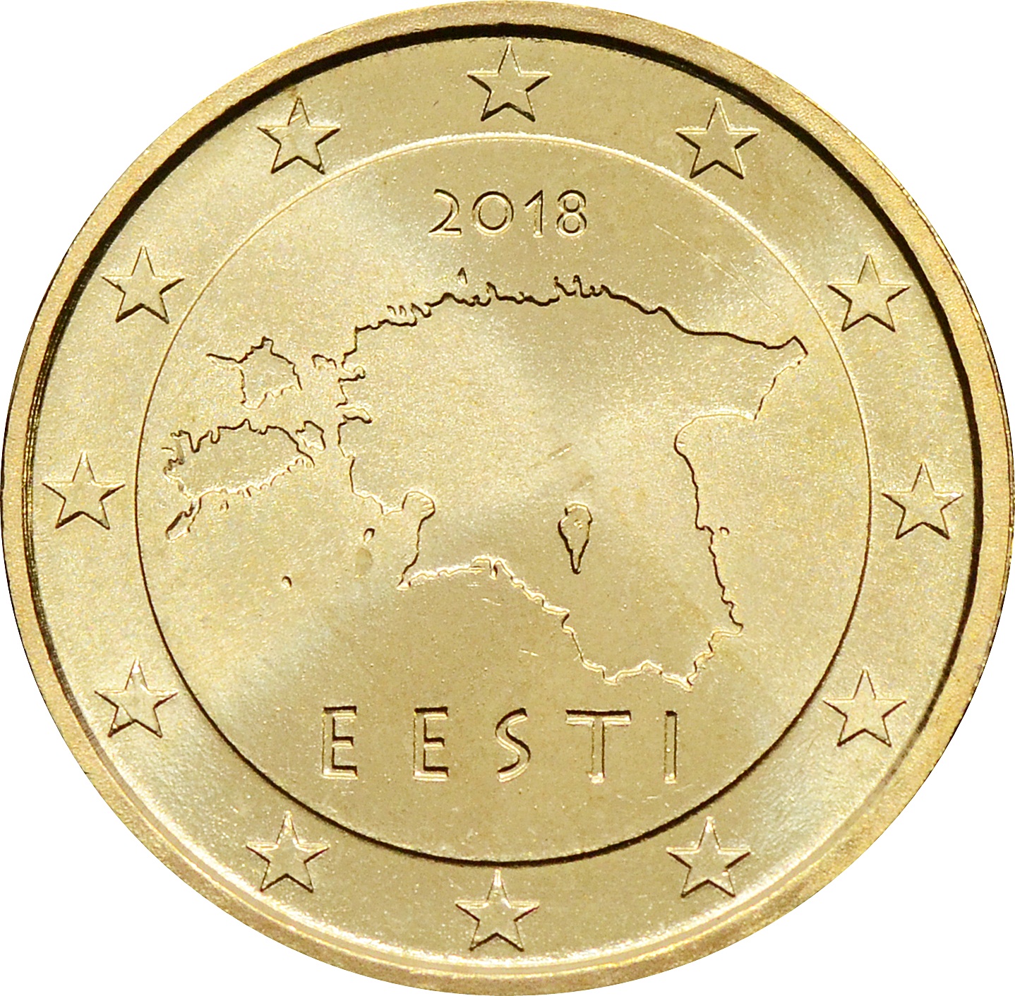 Аверс: по центру изображена современная карта Эстонии и надпись: "EESTI". Выше год чеканки: "2018". Вдоль канта, по кругу, 12 звёзд.