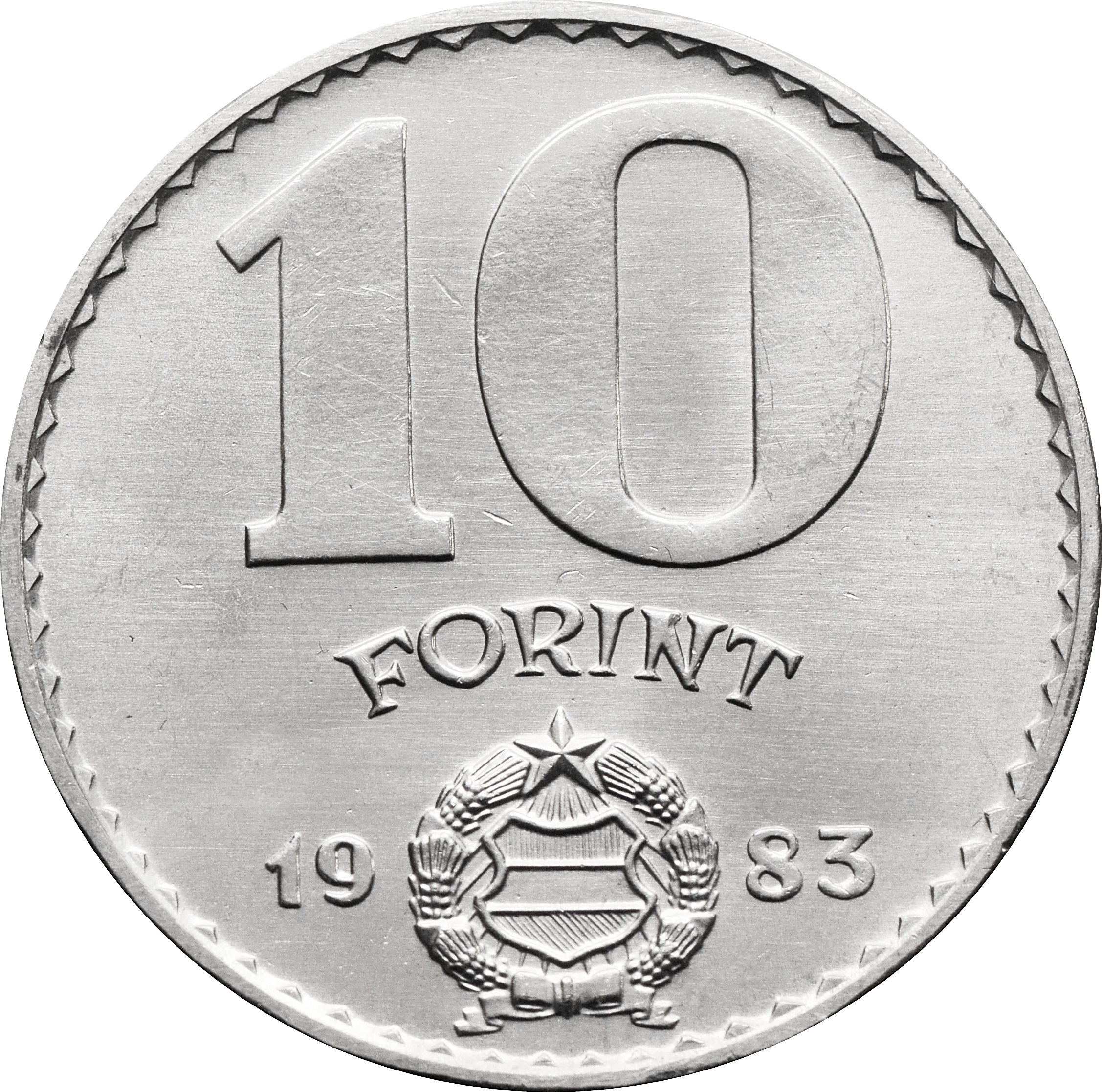 Реверс: по центру указание номинала монеты - большая цифра "10", под ней валюта: "FORINT". Под номиналом расположился герб венгерской народной республики, разделяющий год чеканки на две части: "1983".