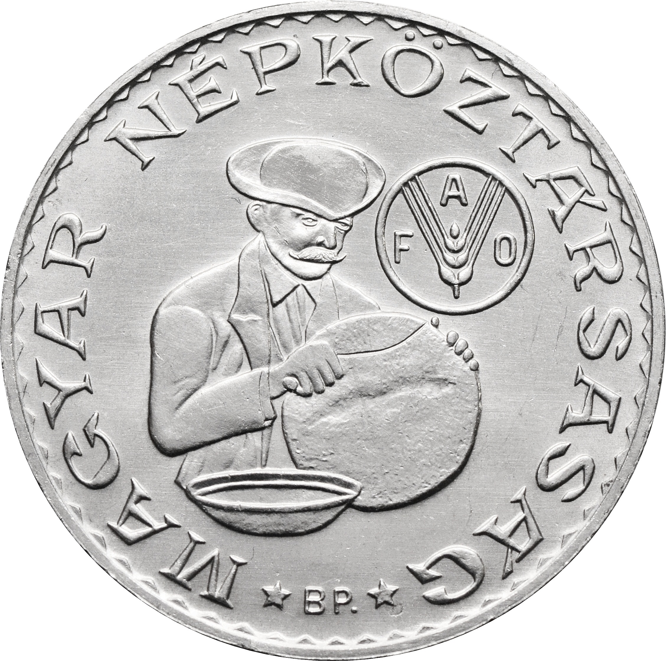 Аверс: в центре изображен фермер. Сверху полукругом расположена надпись: "MAGYAR NÉPKÖZTÁRSASÁG".