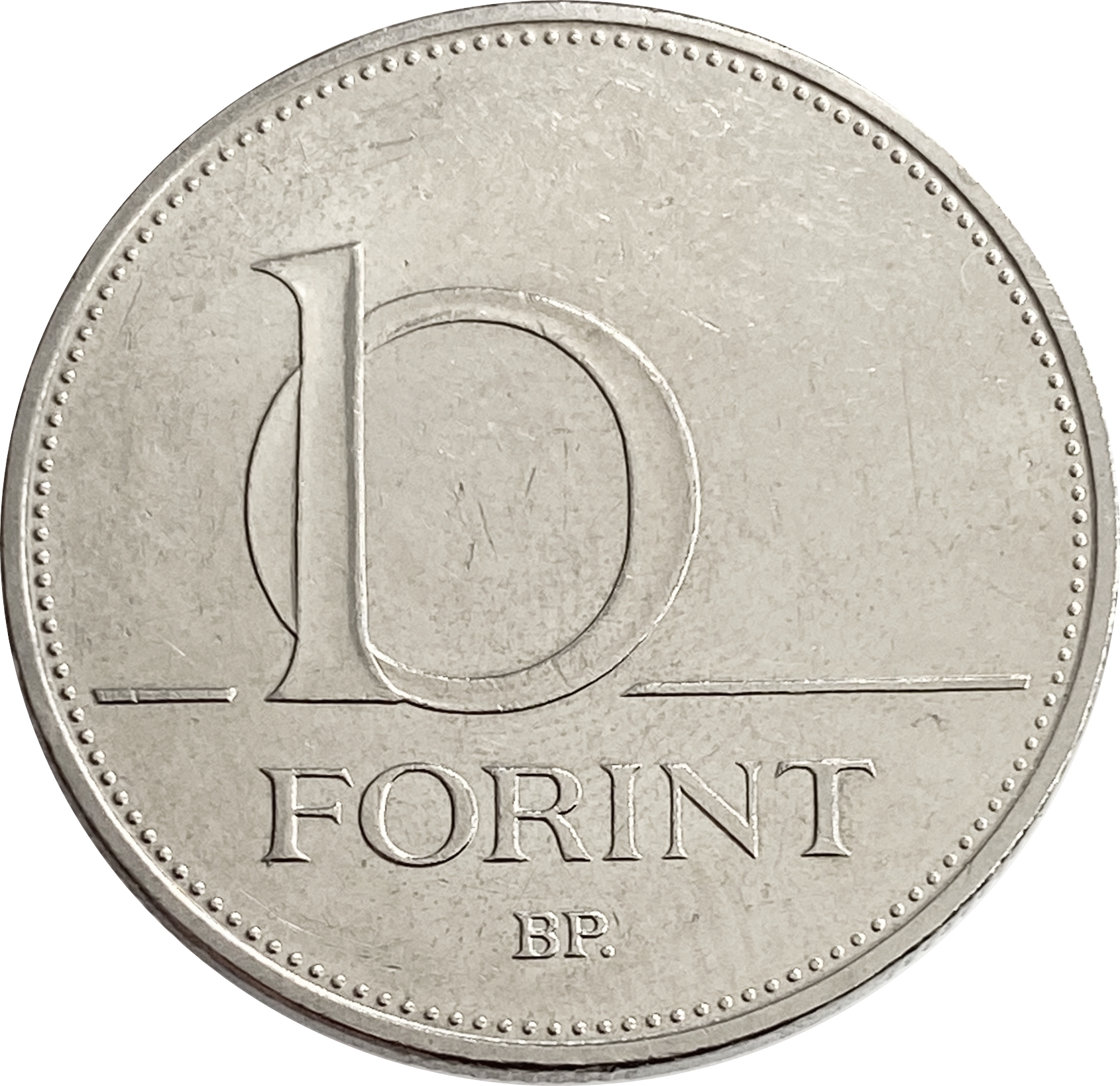 Реверс: чуть левее центра указание номинала монеты в две строки: "10 FORINT". Вдоль края монеты жемчужные горошины.