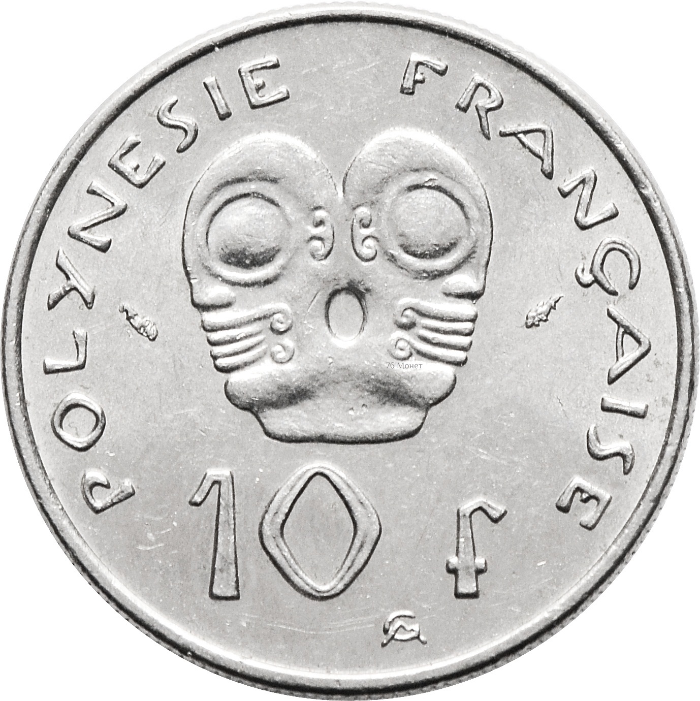 Реверс: по центру изображена маска и номинал монеты: "10 F". Вдоль канта надпись: "POLYNESIE FRANÇAISE".