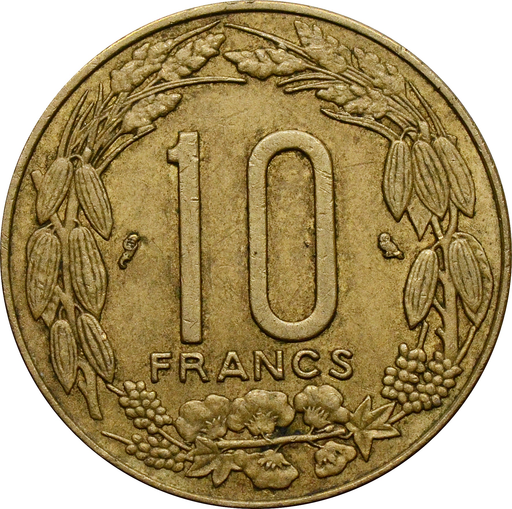 Реверс: прямо по центру монеты указан номинал: "10 FRANCS". Вокруг номинала узор из ветвей растений.