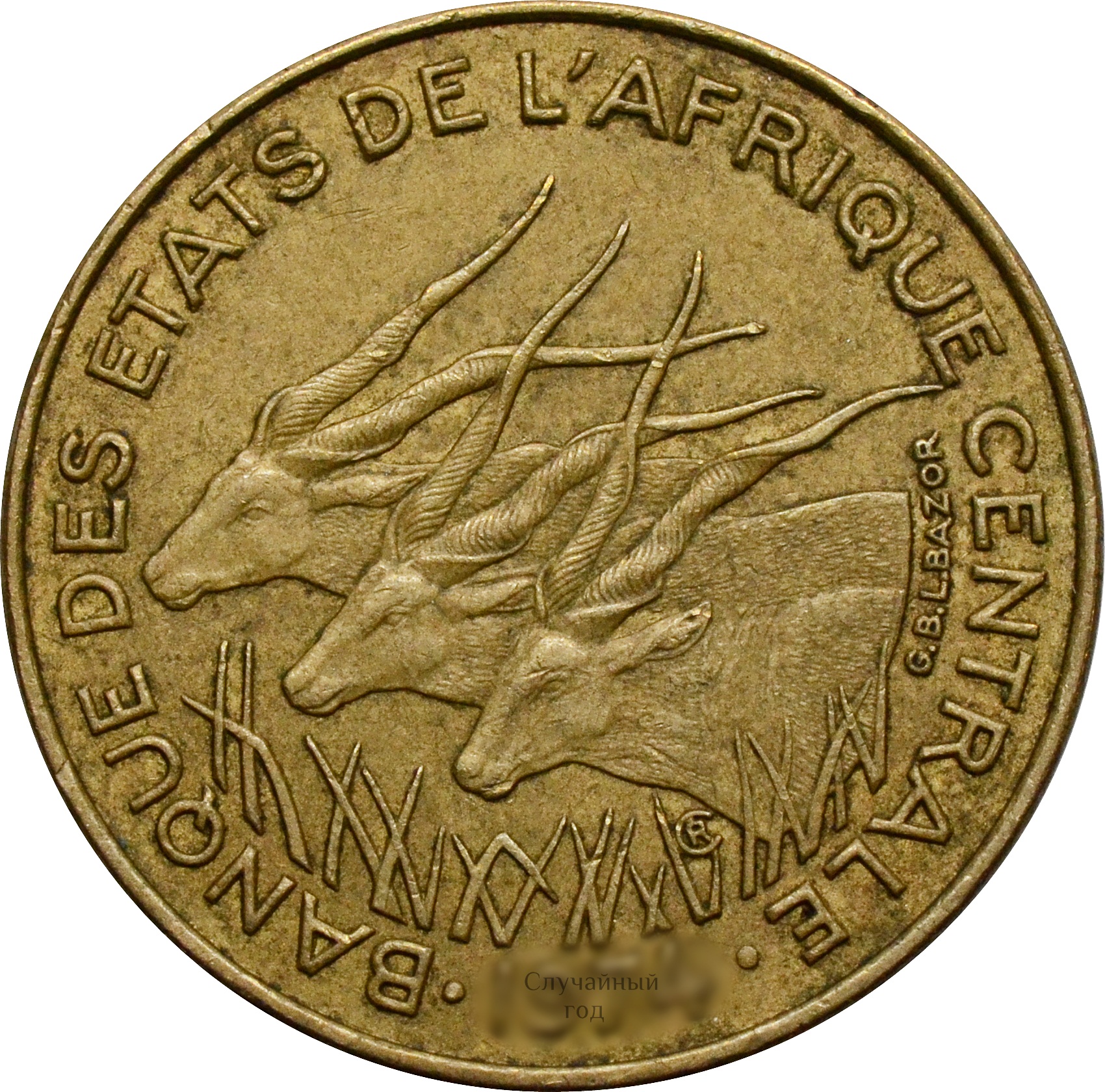Аверс: в центре монеты изображены антилопы. Вдоль канта, по кругу, надпись: "BANQUE DES ETATS DE L'AFRIQUE CENTRALE". В самом низу указан год чеканки.