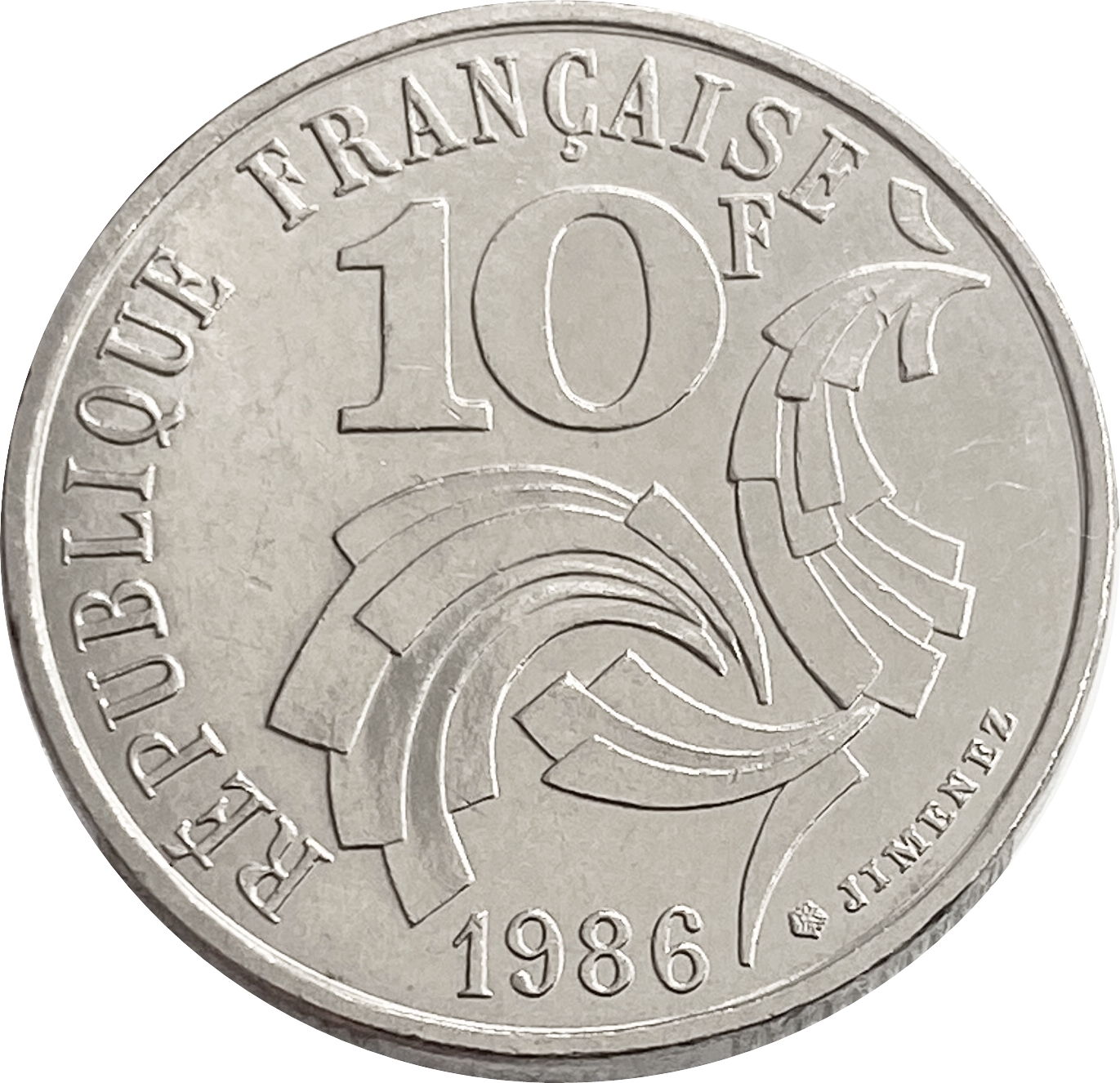 Реверс: чуть выше центра, на фоне орнамента, указан номинал: "10 F". По канту надпись: "RÉPUBLIQUE FRANÇAISE". Внизу год чеканки: "1986".
