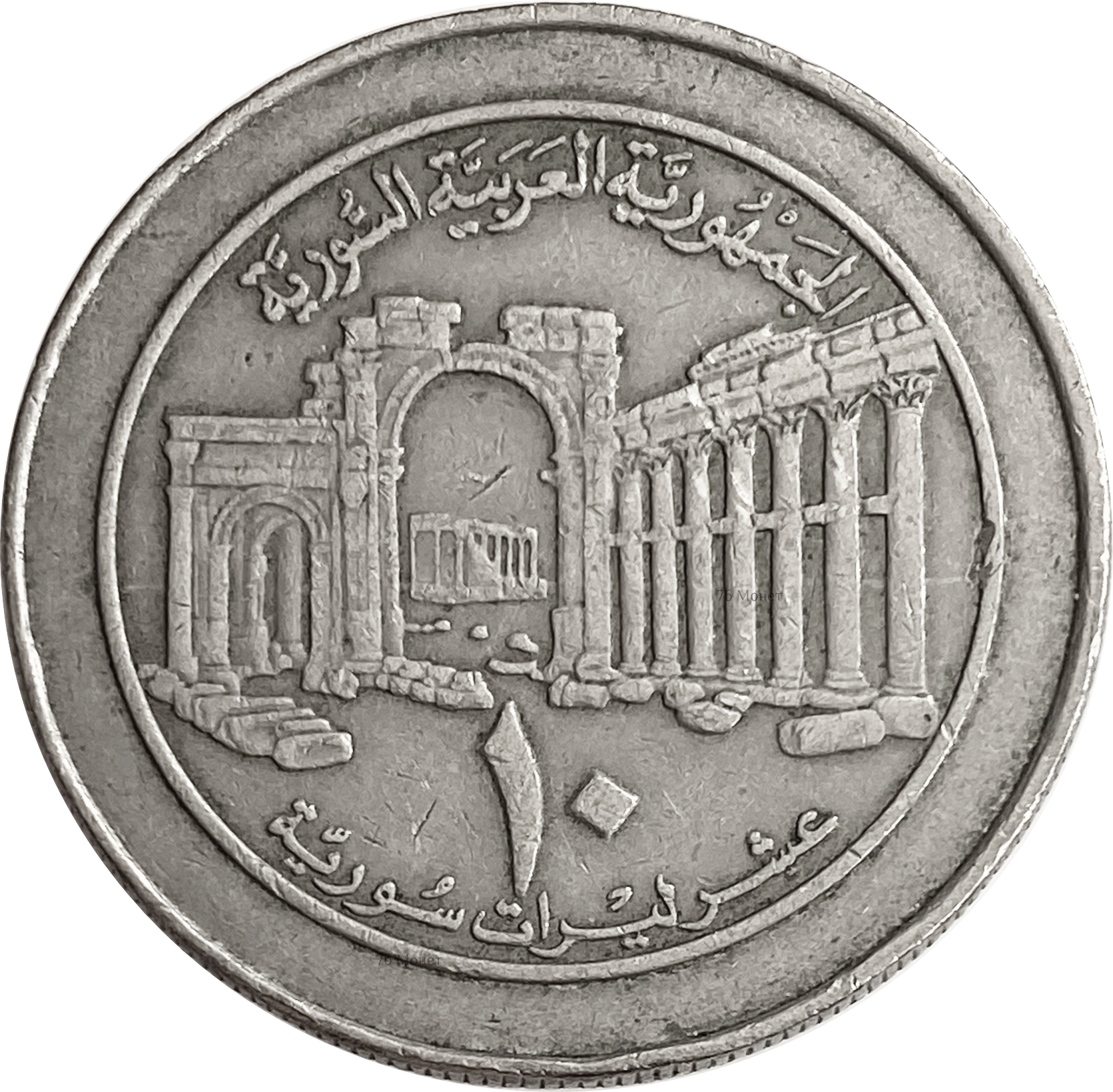 Реверс: в центре монеты изображен древний город Пальмира. Ниже указан номинал арабской цифрой: "١٠" и прописью: "عشر ليرات سورية". Сверху, полукругом, указание страны: "الجمهورية العربية السورية".