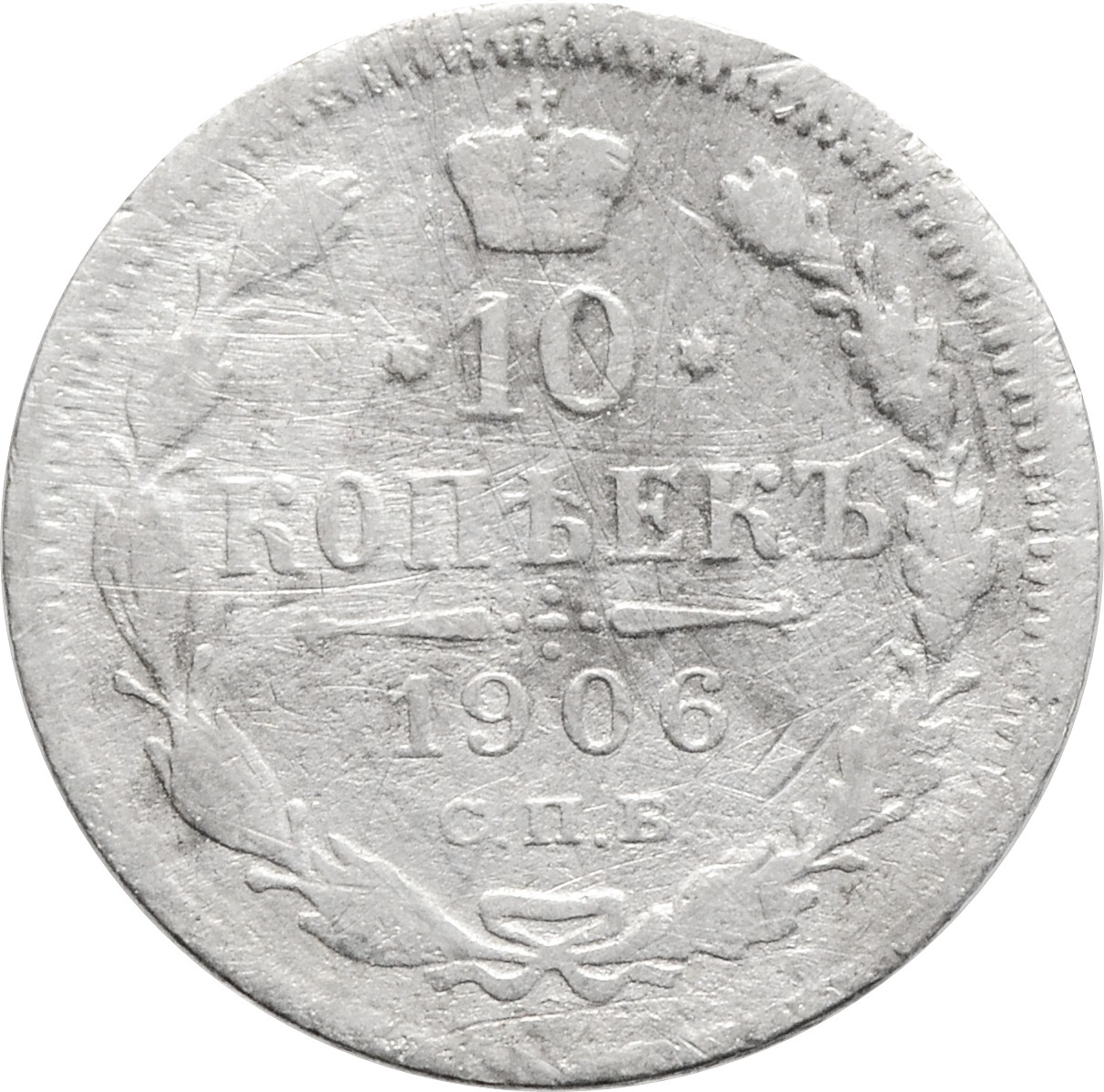 Реверс: по центру указан номинал: "10 КОПЕЕК". Ниже, расположен декоративный разделитель в виде двух разнонаправленных фигурных линий и стилизованным из точек крестом между ними. Под разделителем год чеканки монеты: "1906". Под датой указаны буквы - "СПБ". Вдоль канта, изображен венок из лавровой и дубовой ветвей, которые, перевязаны лентой снизу.