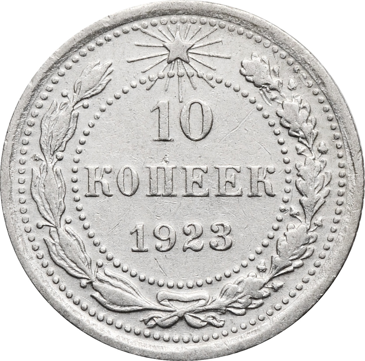 Реверс: по центру монеты указан номинал в две строки: "10 копеек". Ниже год чеканки монеты: "1923". Под годом чеканки, вдоль канта, расположен импровизированный венок. Сверху изображена пятиконечная звезда.