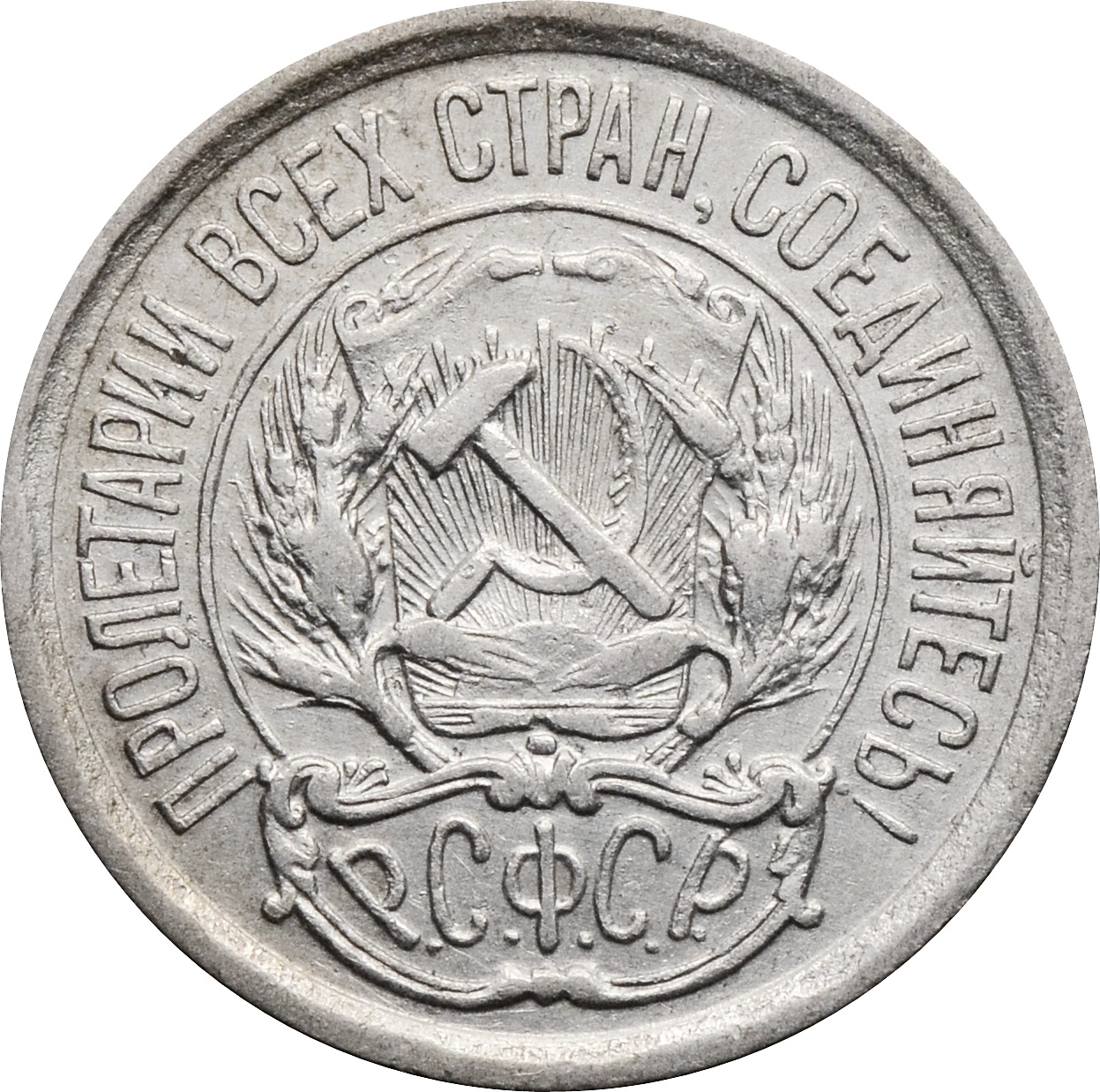 Аверс: в центре монеты расположен герб РСФСР. Под ним расположена аббревиатура государства: "Р.С.Ф.С.Р.". Вдоль канта, по кругу, расположена надпись: "ПРОЛЕТАРИИ ВСЕХ СТРАН, СОЕДИНЯЙТЕСЬ!".