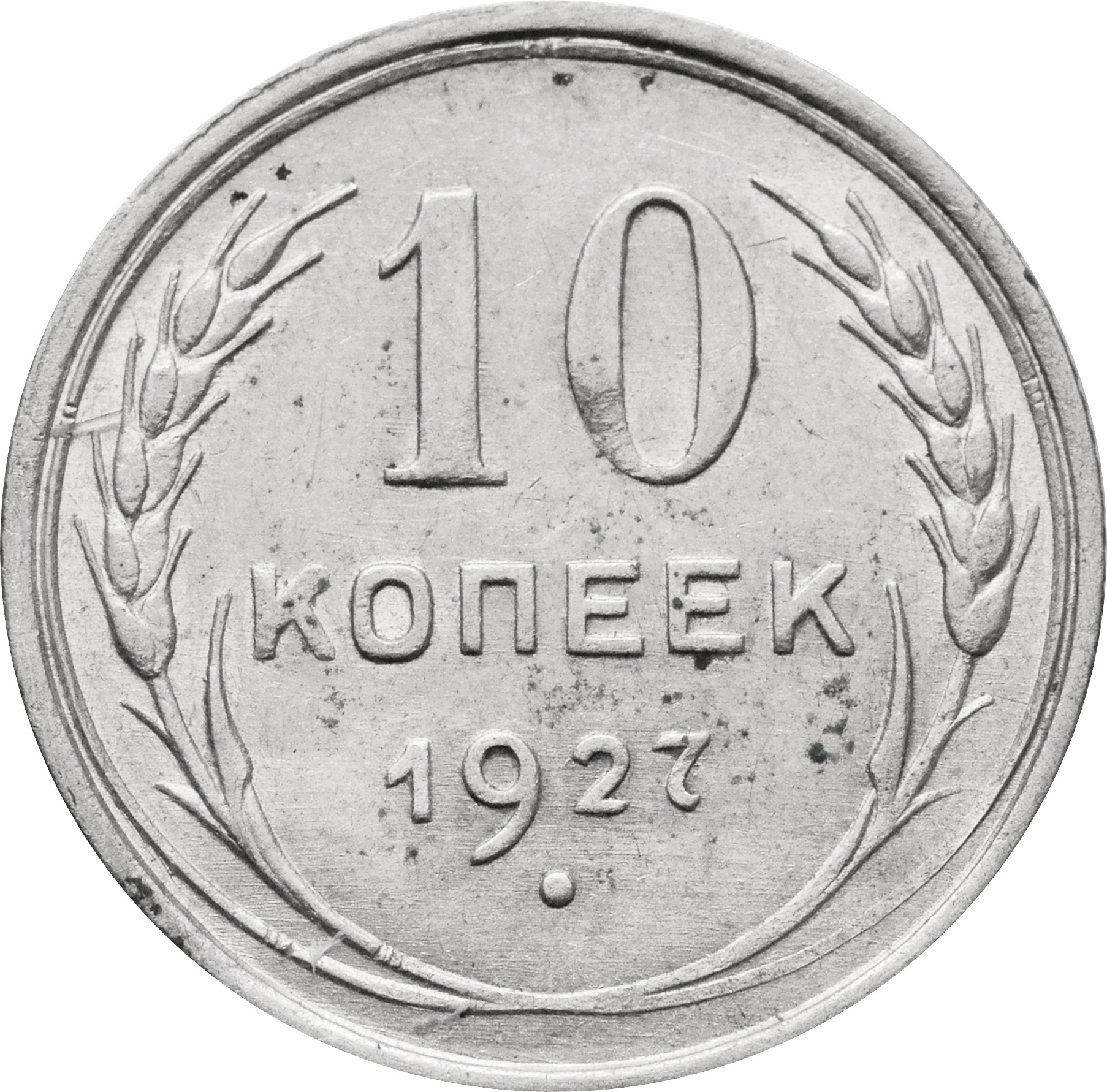 Реверс: по центру монеты указан номинал в две строки: "10 копеек". Сразу под номиналом размещен год чеканки: "1927". Справа и слева, снизу вверх, вдоль канта монеты, два пересекающихся между собой колоса.