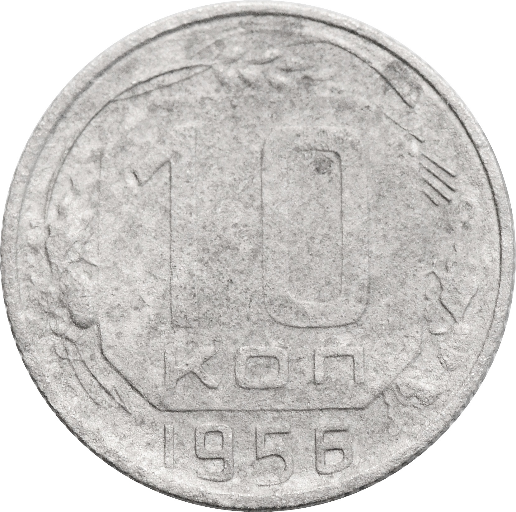 Реверс: чуть выше центра монеты указан номинал в две строки: "10 КОП", ниже расположен год чеканки: "1956".
