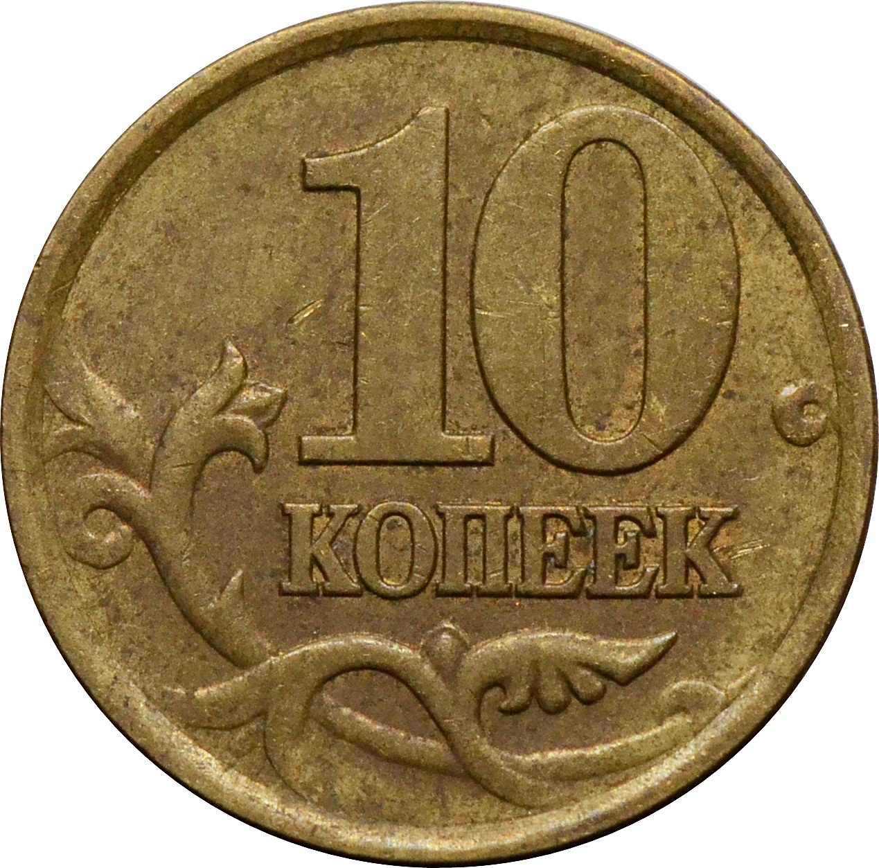 Реверс: по центру обозначение номинала монеты: "10 КОПЕЕК". В нижней части диска стилизованный растительный орнамент в виде двух ветвей