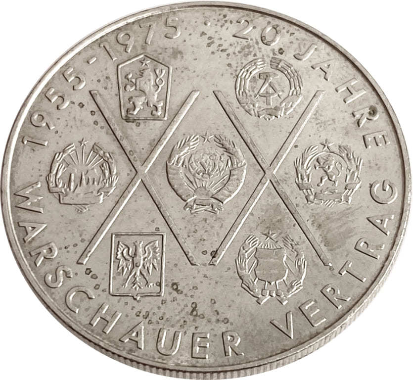 Реверс: по центру изображение гербов стран участников Варшавского договора. Вдоль канта надпись: "1955-1975 / 20 JAHRE / WARSCHAUER VERTRAG".