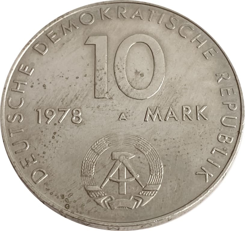 Аверс: чуть ниже центра монеты размещен герб ГДР. Выше указан номинал: "10 MARK / 1978". Вдоль канта надпись: "DEUTSCHE DEMOKRATISCHE REPUBLIK".