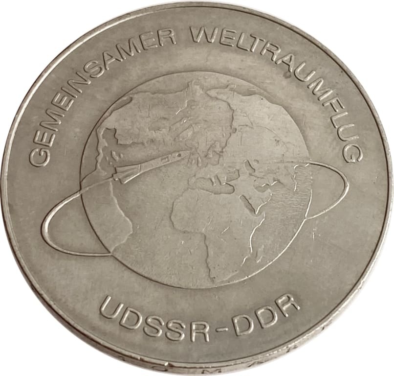 Реверс: по центру изображение космического корабля облетающего земной шар. Вдоль канта, сверху, располагается надпись: "GEMEINSAMER WELTRAUMFLUG / UDSSR-DDR".