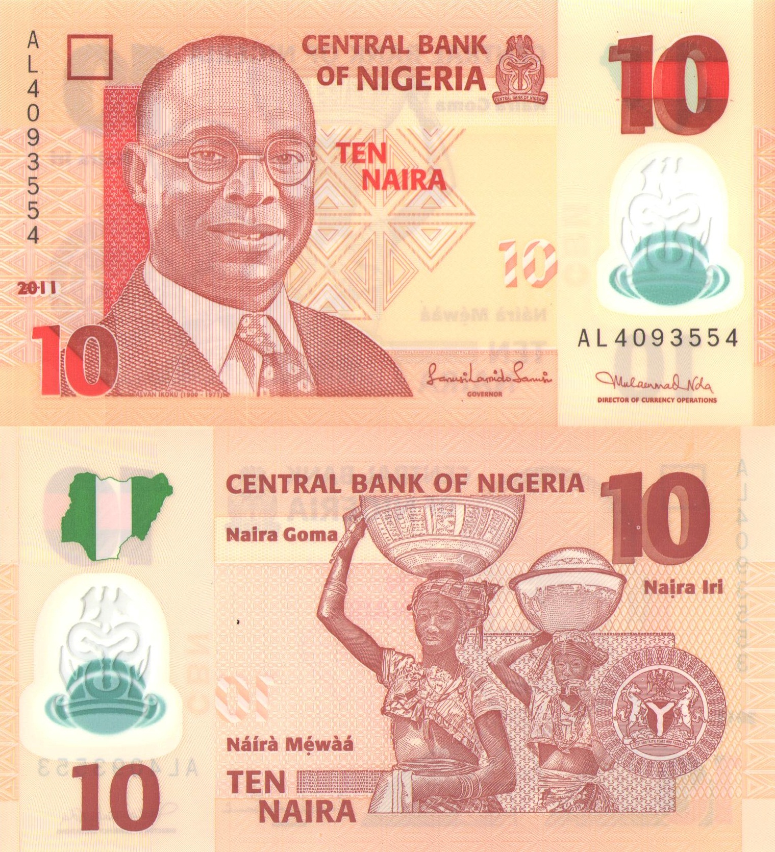 Лицевая сторона: левее расположен серийный номер и год образца банкноты - "2011". Так же номер продублирован в правом нижнем углу. В центре портрет доктора Алвана Икоку. Рядом надпись: "CENTRAL BANK OF NIGERIA" и номинал прописью: "TEN NAIRA".