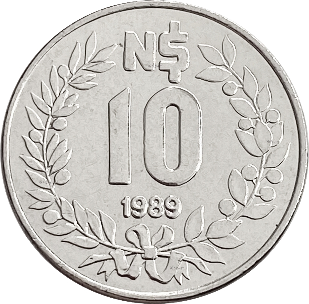 Реверс: по центру указан номинал: "N$ 10" и год чеканки: "1989" в обрамлении венка.