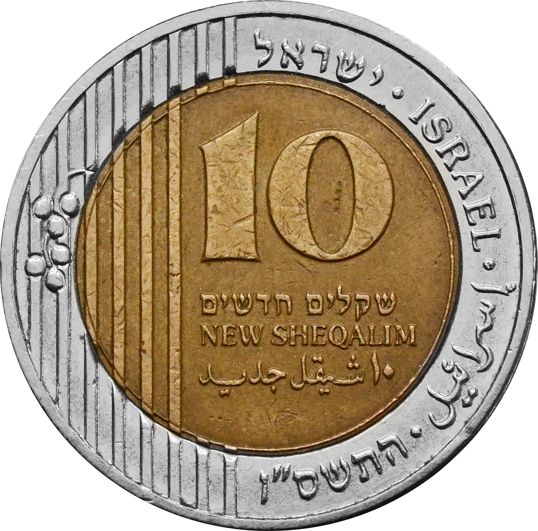 10 שקלים חדשים / 10 شيكل إسرائيلي جديد". Справа, полукругом, вдоль канта монеты название страны, на разных языках: "ISRAEL / اسرائيل /ישראל", а также год чеканки.
