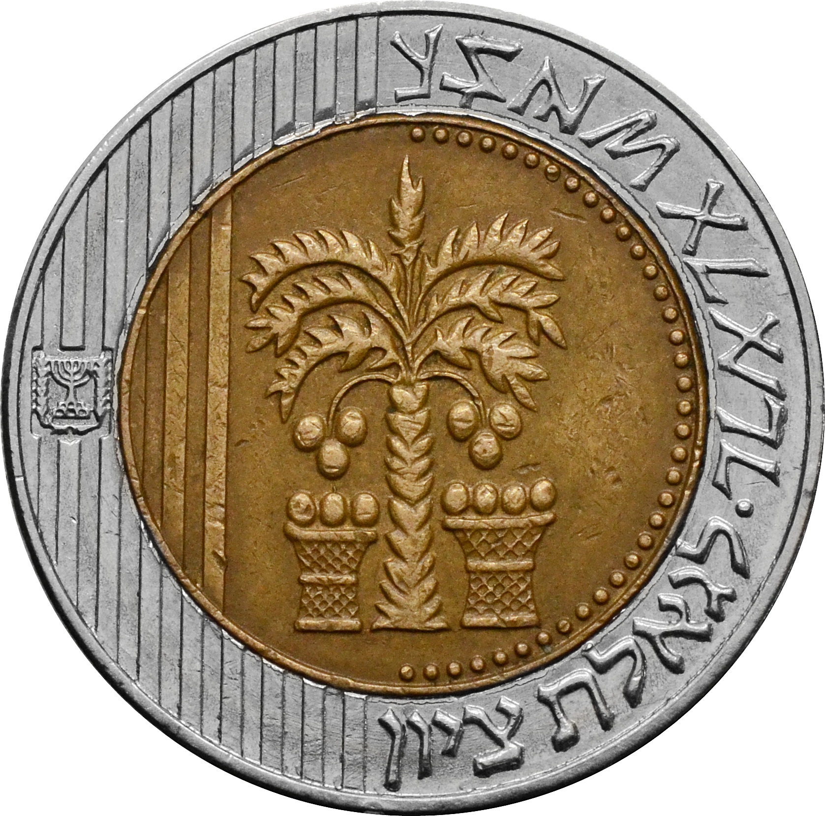 Аверс: по центру расположено стилизованное изображение финиковой пальмы с семью листьями и две корзины. Слева – герб страны. В правой части монеты наискось надпись: "לגאלת ציון".