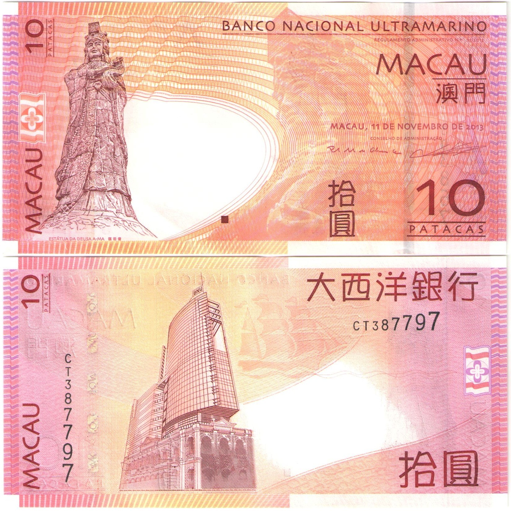 Оборотная сторона: в левой части боны изображена статуя Мазу Эстатуа да Деуса А-Ма. В левом верхнем углу указание номинала: "10 PATACAS" и чуть ниже подпись: "MACAU". В правой части сверху указание банка выпустившего банкноту: "BANCO NACIONAL ULTRAMARINO / MACAU". Ниже дата образца боны: "MACAU, 11 DE NOVEMBRO DE 2013". В самом низу номинал: "10 PATACAS".