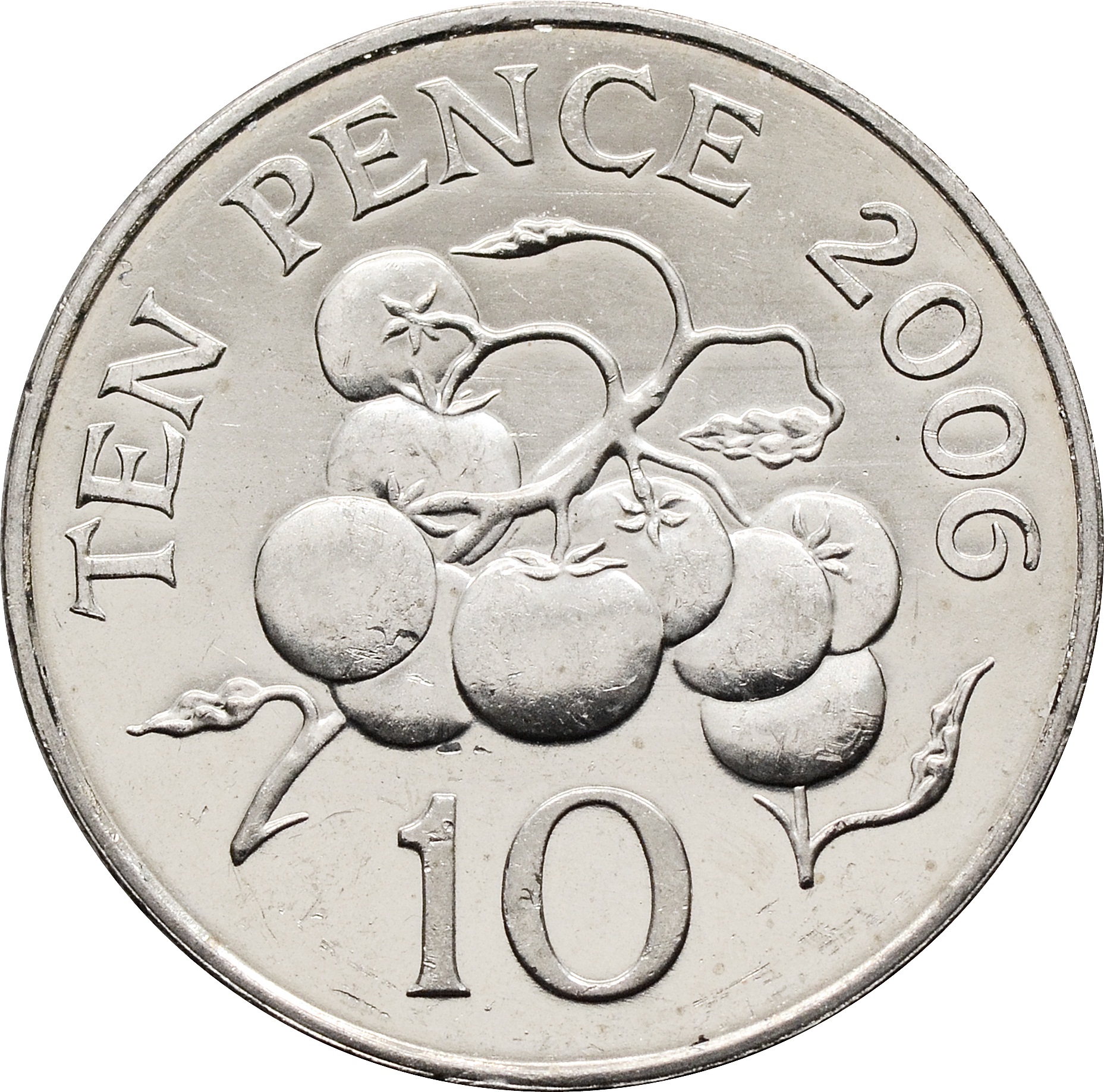 Реверс: в центре изображена ветка томатов. Сверху указан номинал монеты: "TEN PENCE" и год чеканки: "2006". Снизу указание номинала цифрой: "10".