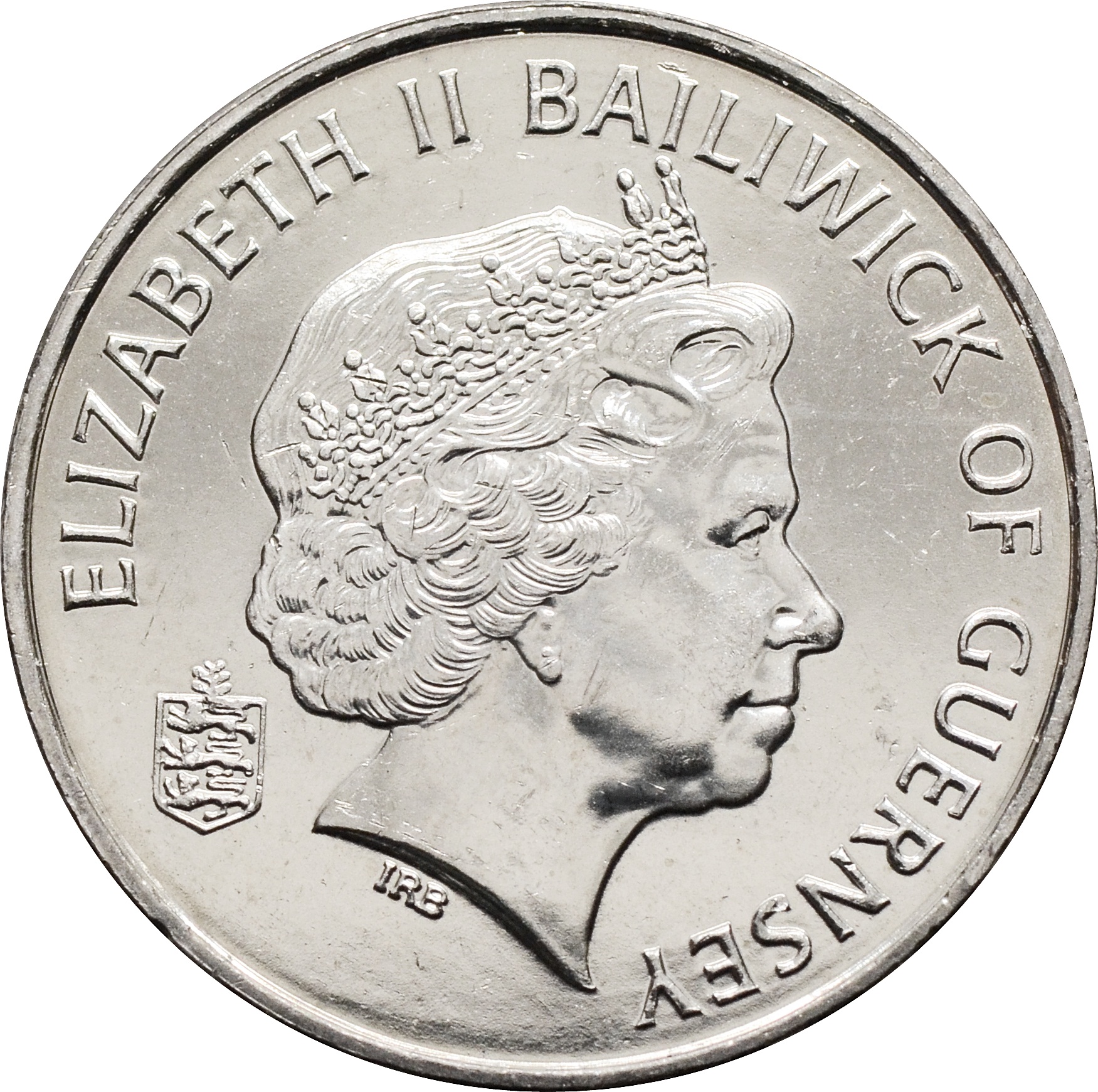 Аверс: по центру монеты расположен портрет королевы Елизаветы II вправо. Вдоль канта, полукругом надпись: "ELIZABETH II BAILIWICK OF GUERNSEY".