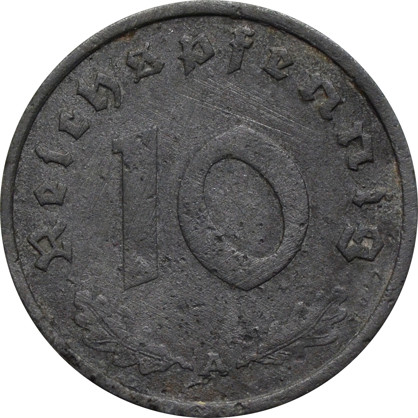 Реверс: в центре монеты указан номинал - цифра "10". Сверху надпись: "Reichspfennig". Под номиналом изображены два дубовых листа и буква монетного двора: "A".